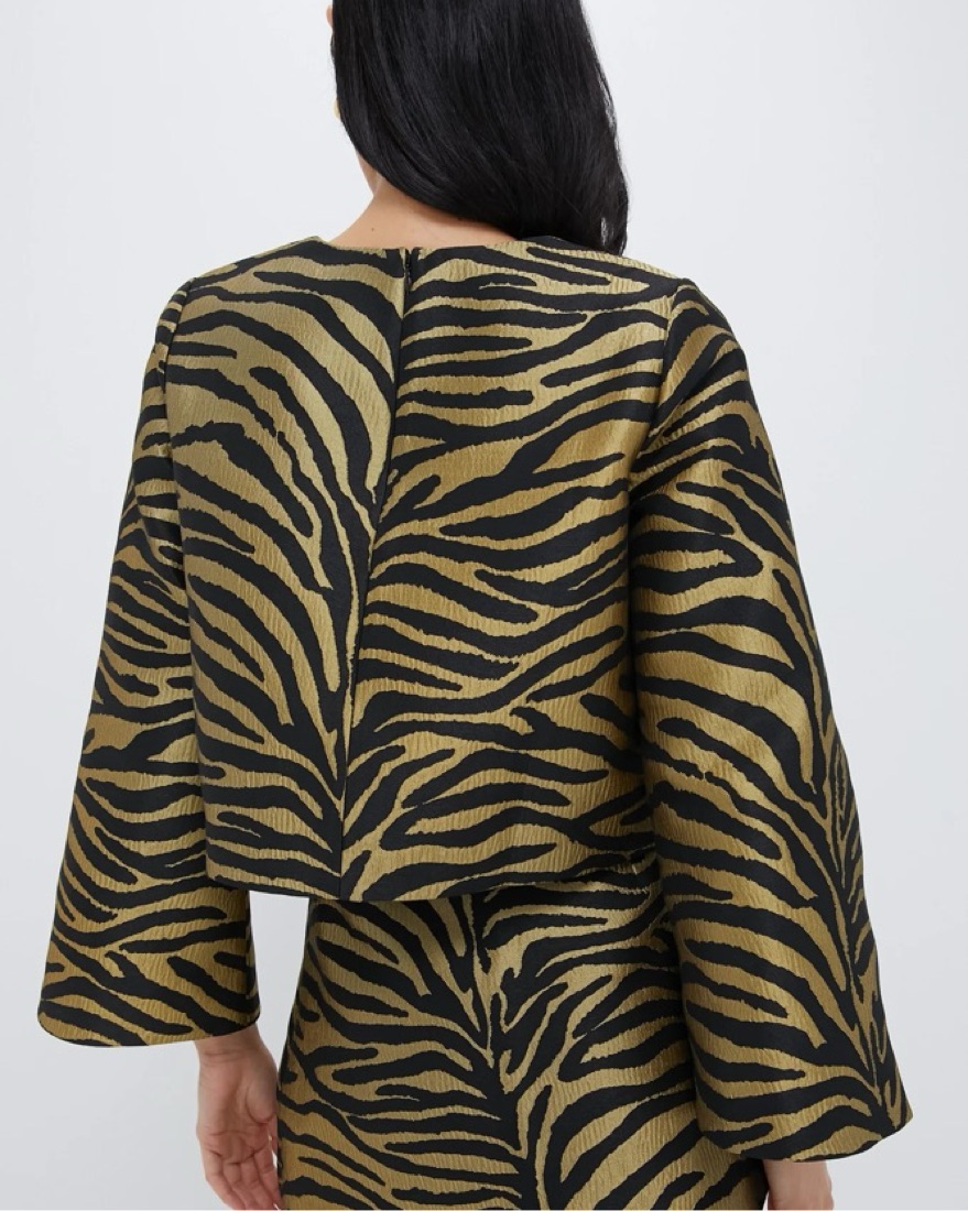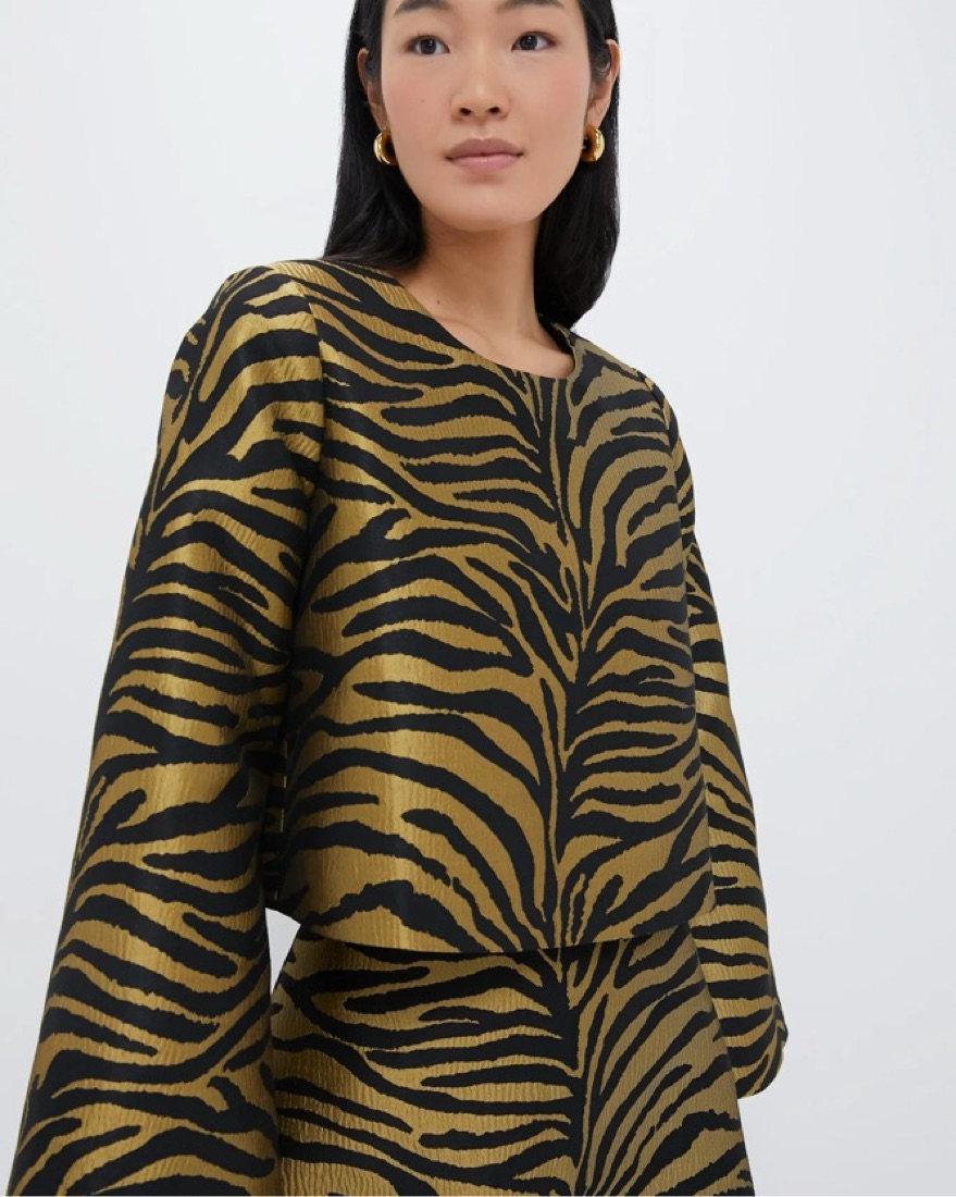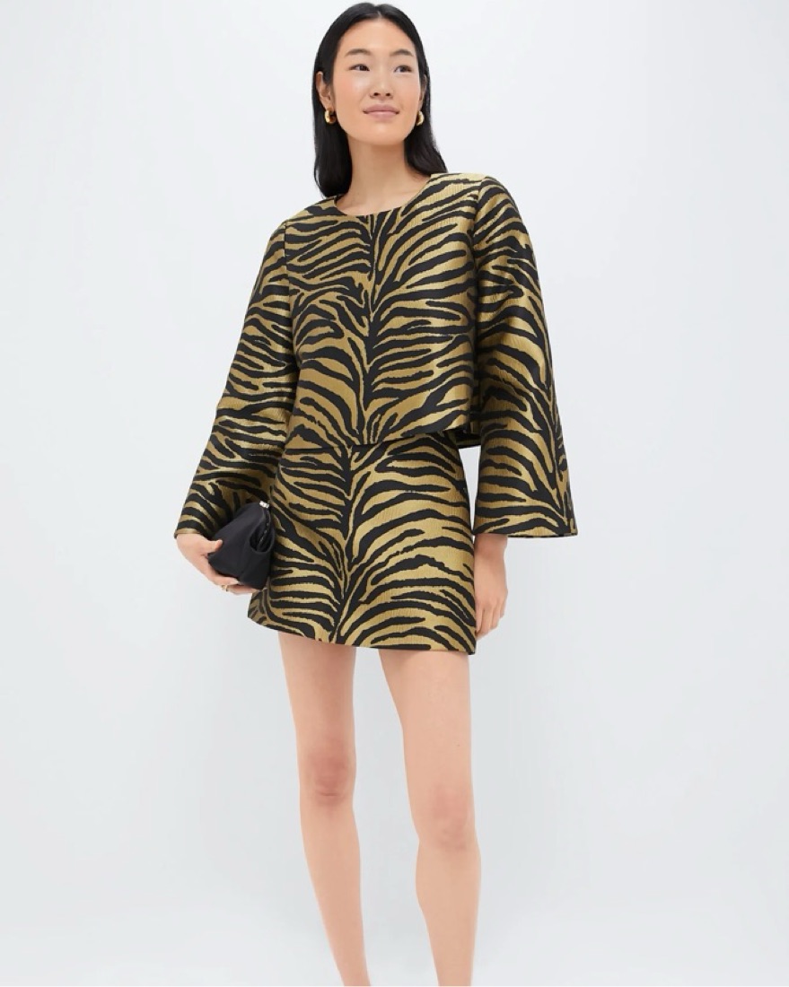 Tuckernuck jacquard top & skirt. Perfect for the holidays, Christmas parties, birthdays, date night. Featuring a tiger print on a structure jacquard fabric and flattering cropped, bell-sleeve silhouette, this is the ultimate chic look. Tags: realisation par, revolve, reformation