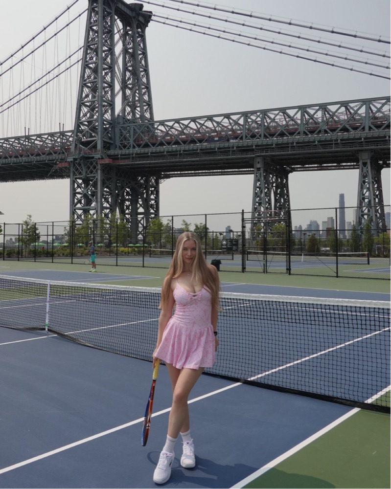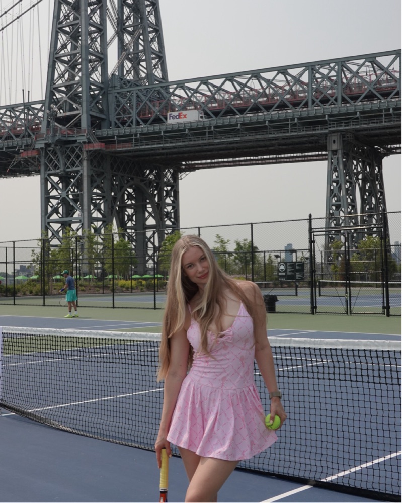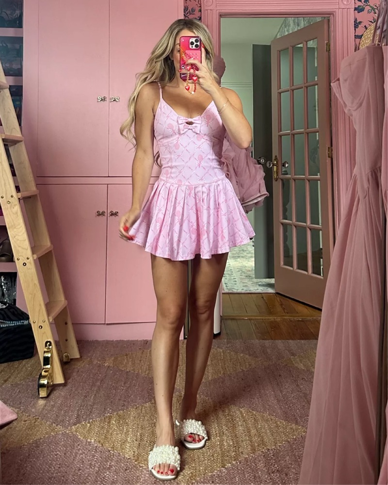 Designed with a lightweight, breathable fabric, this active dress features built-in shorts for functionality, bra cups at the bust, functional pockets, princess and a center front seam. This sporty mini has our baby tennis print all over, thin spaghetti straps, a bow detail at center front