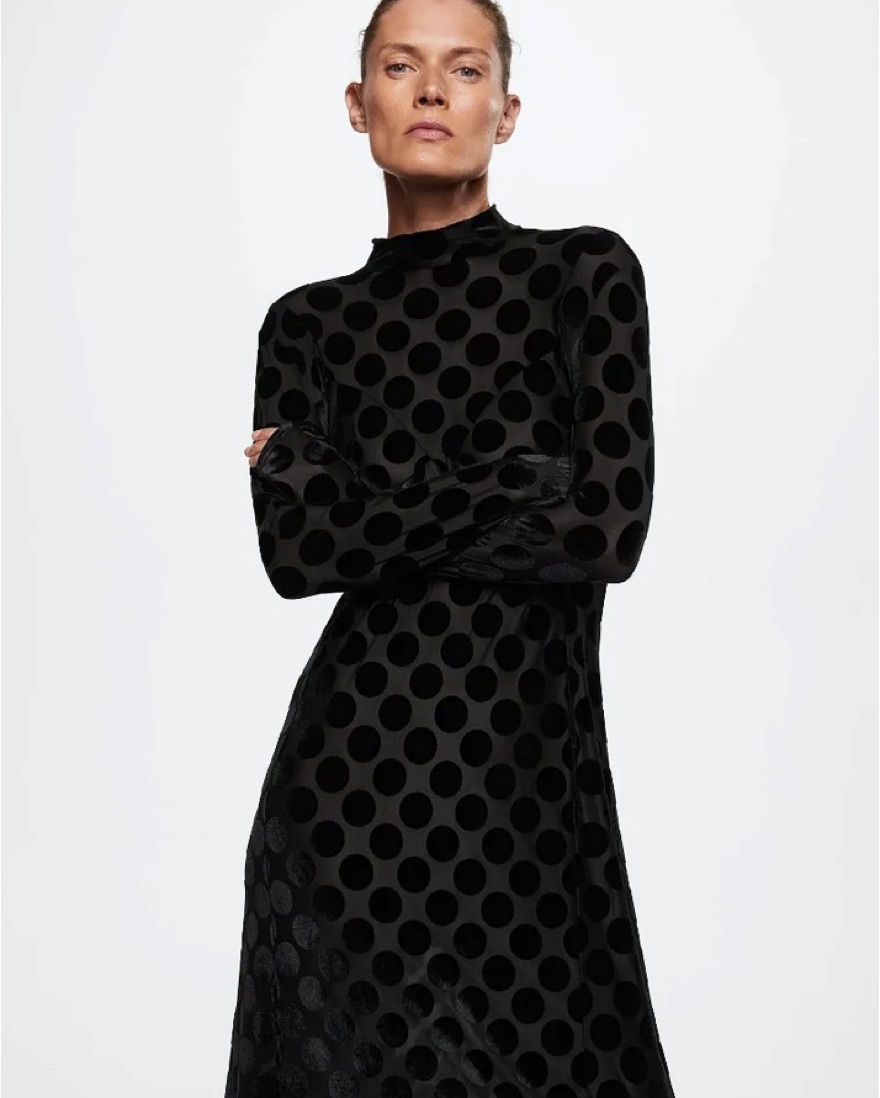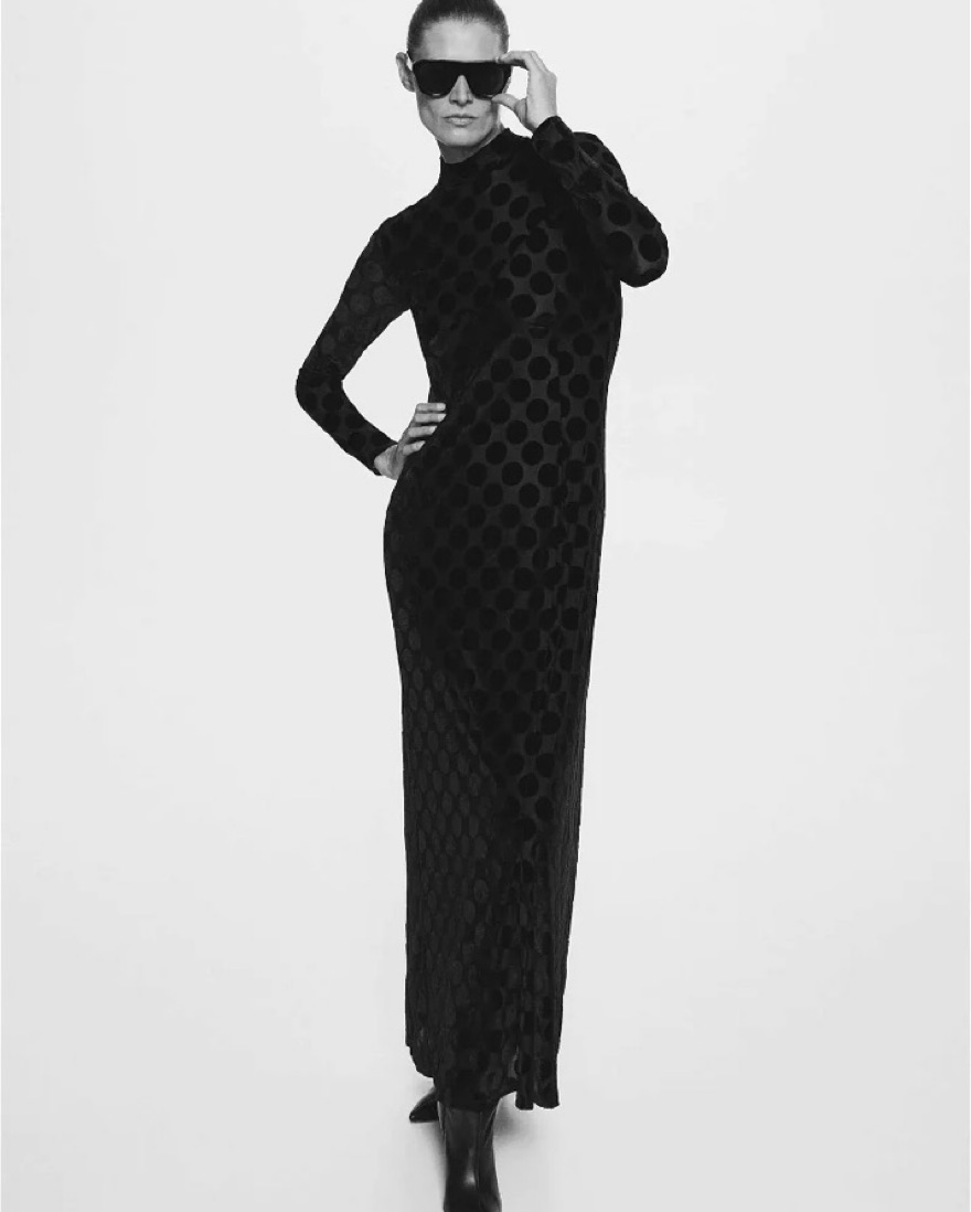 Black maxi dress from Mango with velvet polka dots. Super glamorous dress, perfect for black tie events, black tie wedding, NYE party, or Christmas. Originally size M but tailored to fit the XS/S (shown on me 5.2”).