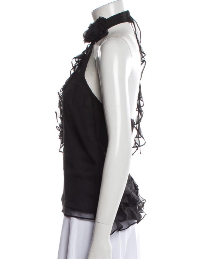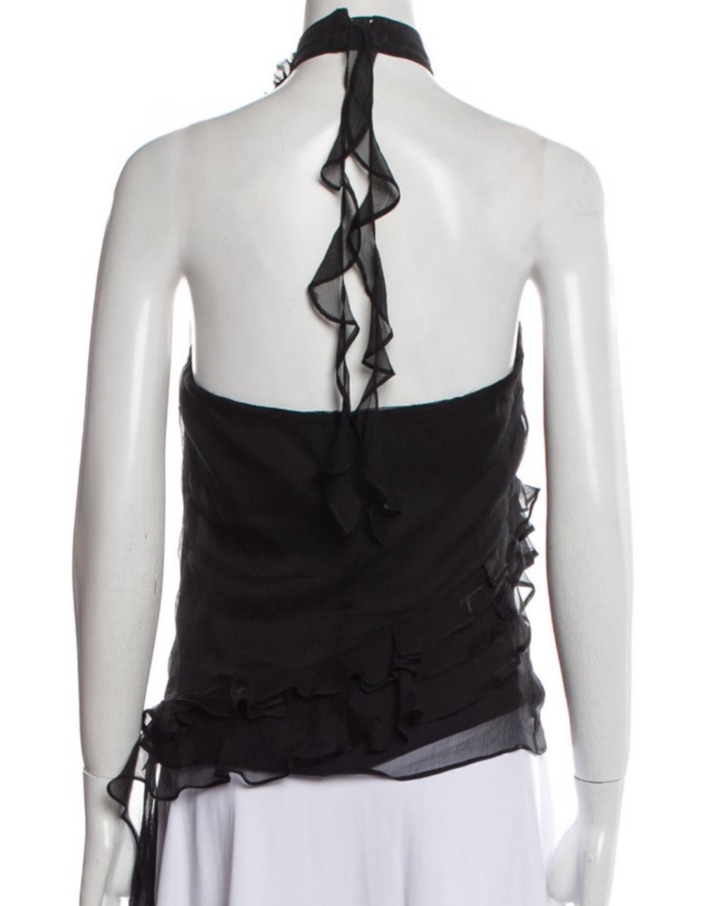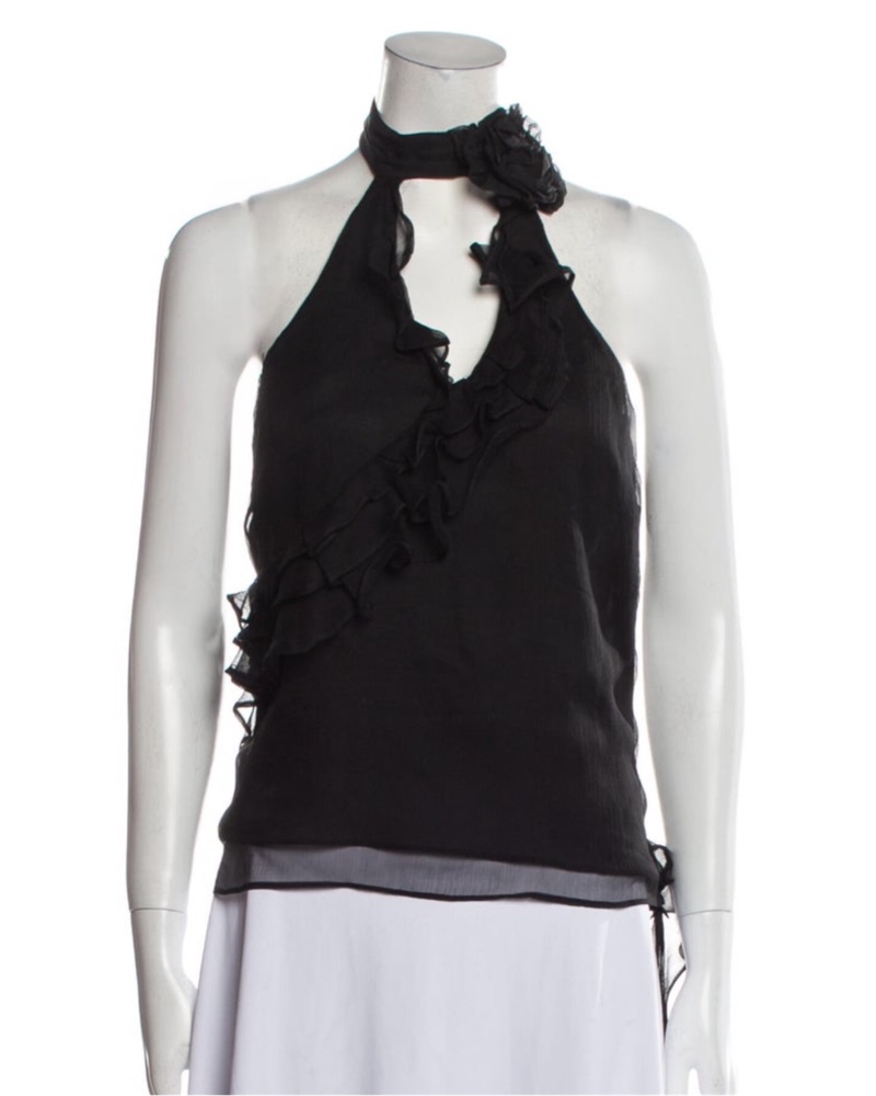 Black halter top with floral detailing. There is a hook and the closure on the halter and zipper on the side.