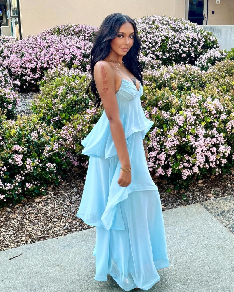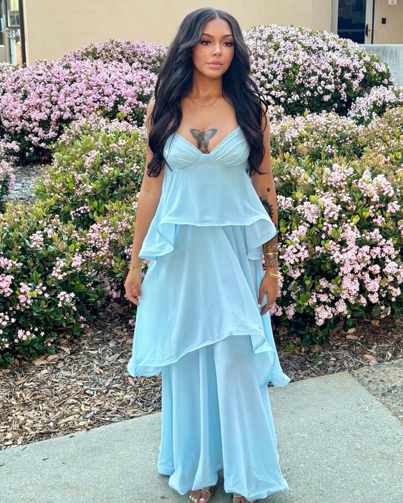 This stunning baby blue maxi dress features a flattering layered design and will elevate any formal or special occasion!