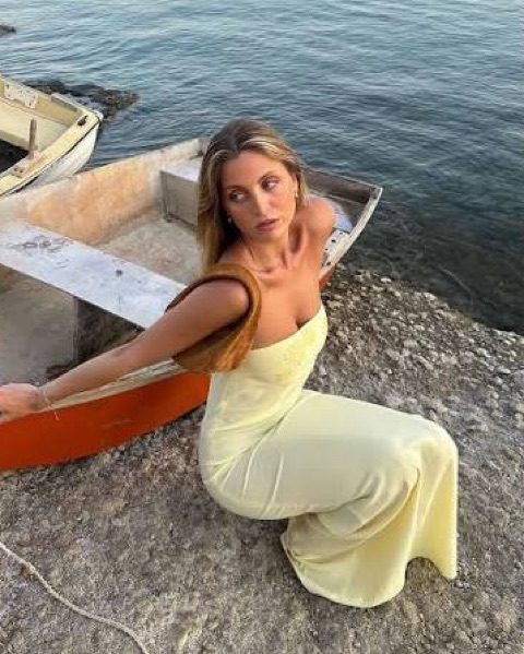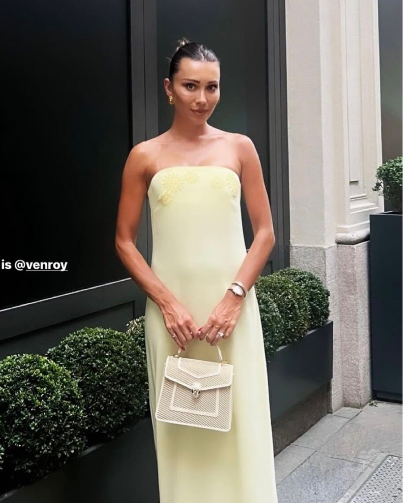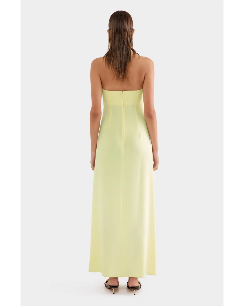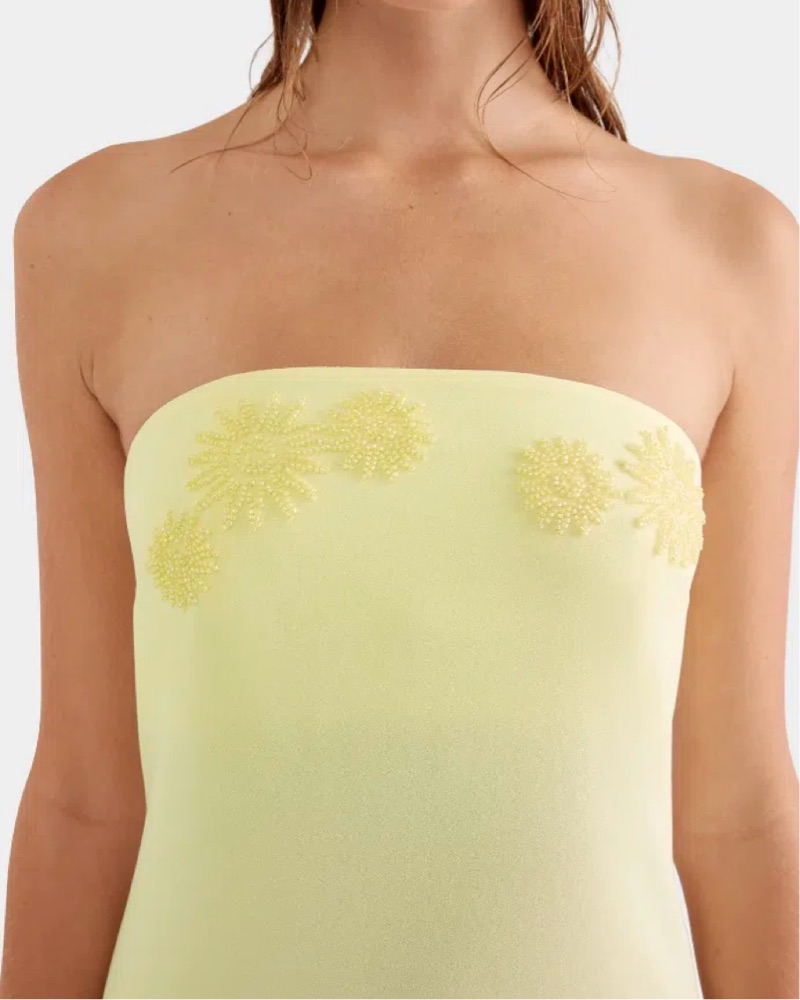 strapless maxi dress in butter yellow from Venroy! so comfy & flattering on. can fit S/M sizes with elastic band