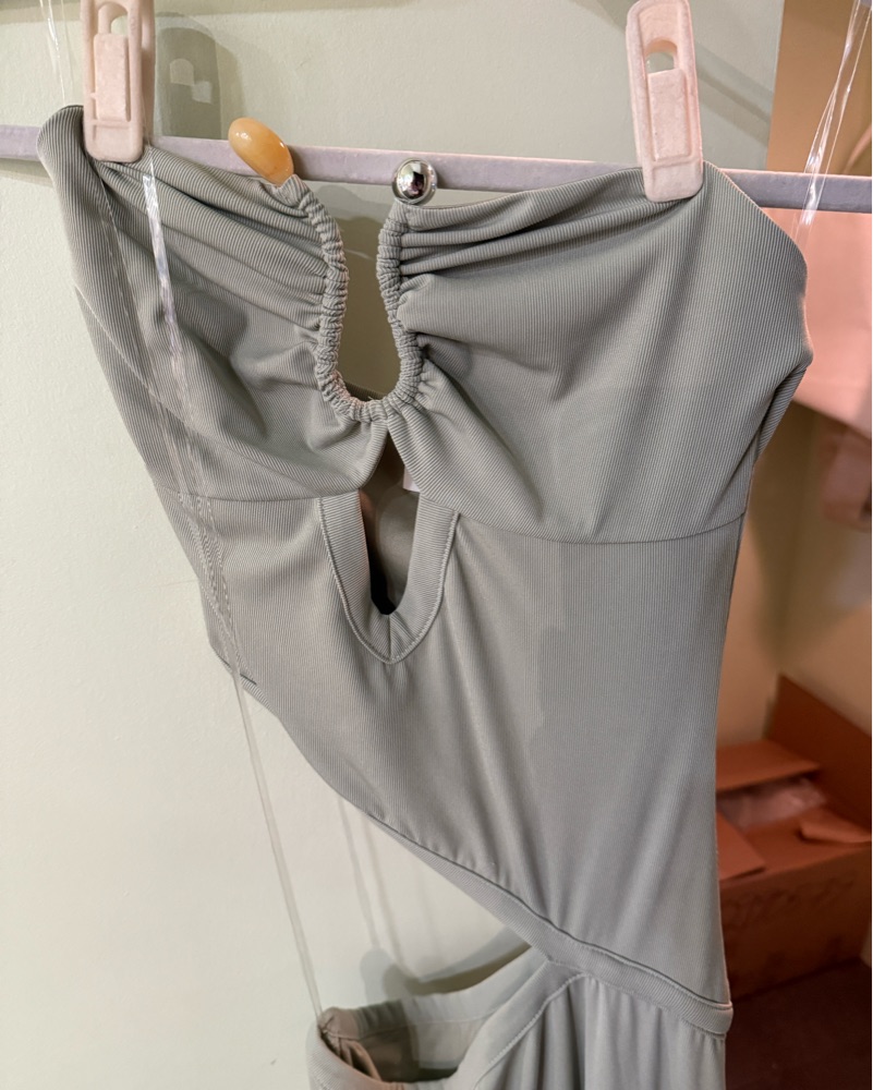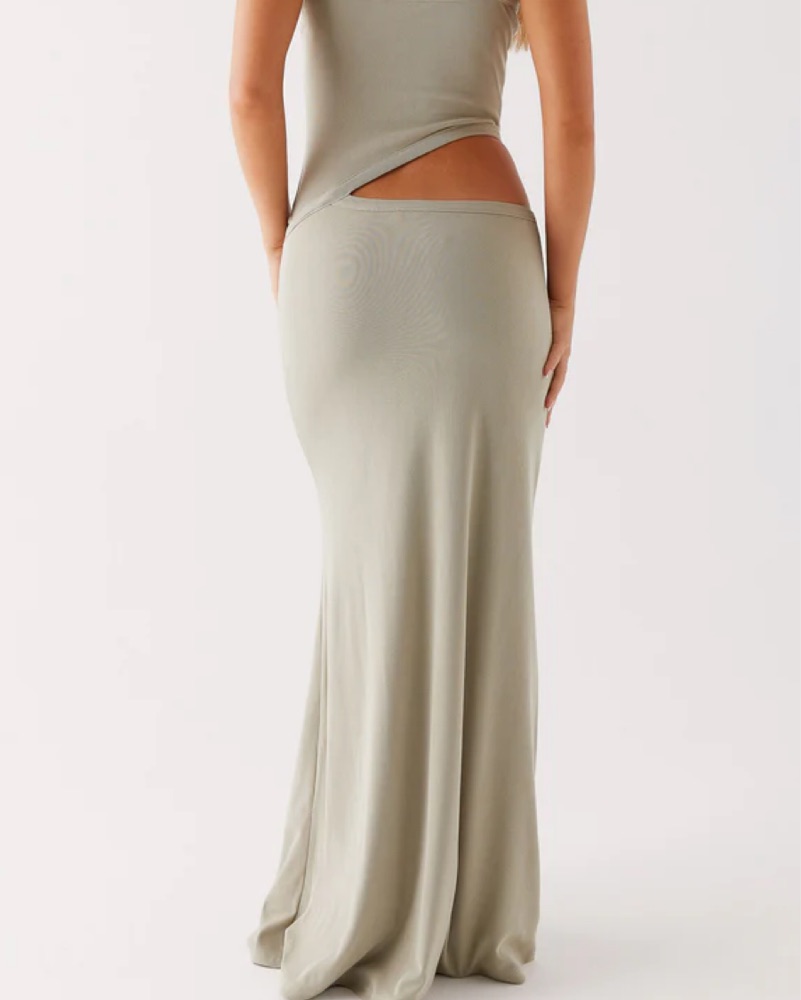 This minimalist maxi dress in a sophisticated gray hue is perfect for a special occasion or formal event. The draped design and cut-out details create a flattering, elegant look.