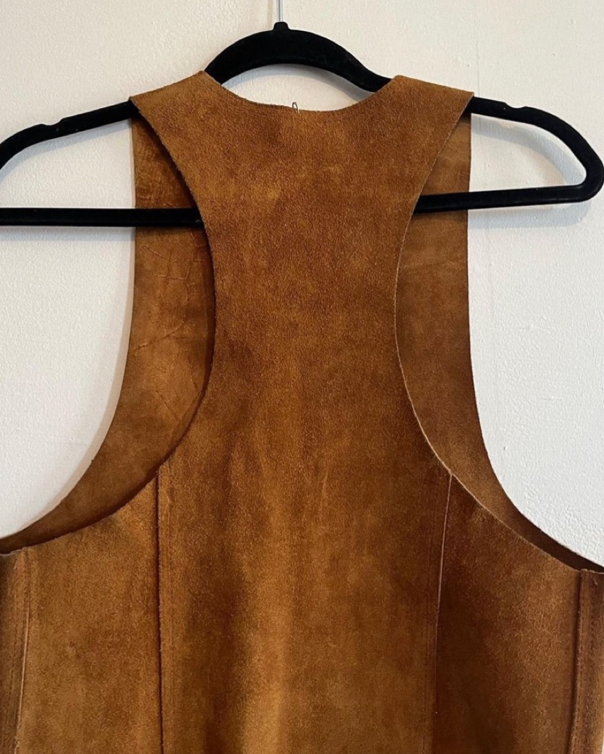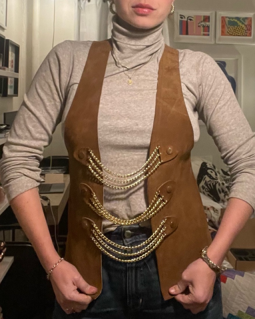 This vest has chain snaps at the front that give it just the right amount of edge. I have a 36” bust; I think this works on me and otherwise would look good on someone narrower, so that’s why I’ve listed it as a small. Would be cool with just a tank top or classy with a turtleneck.