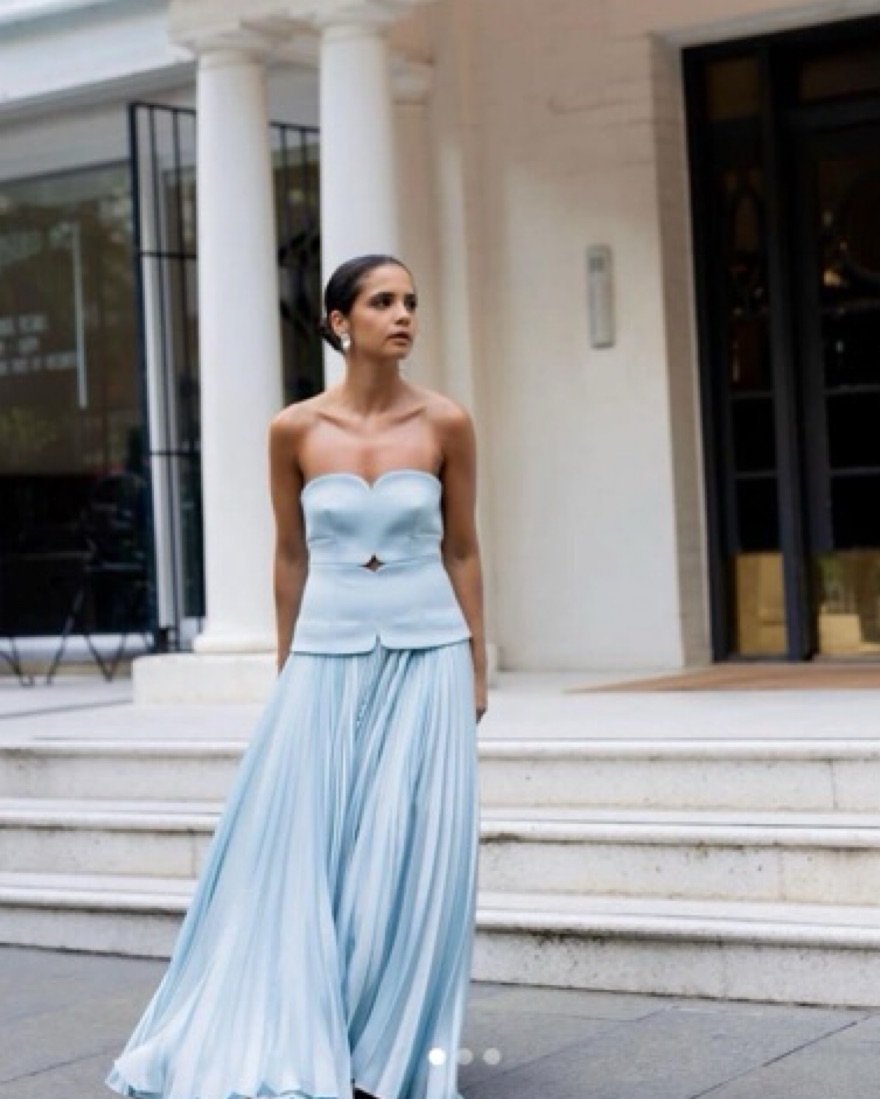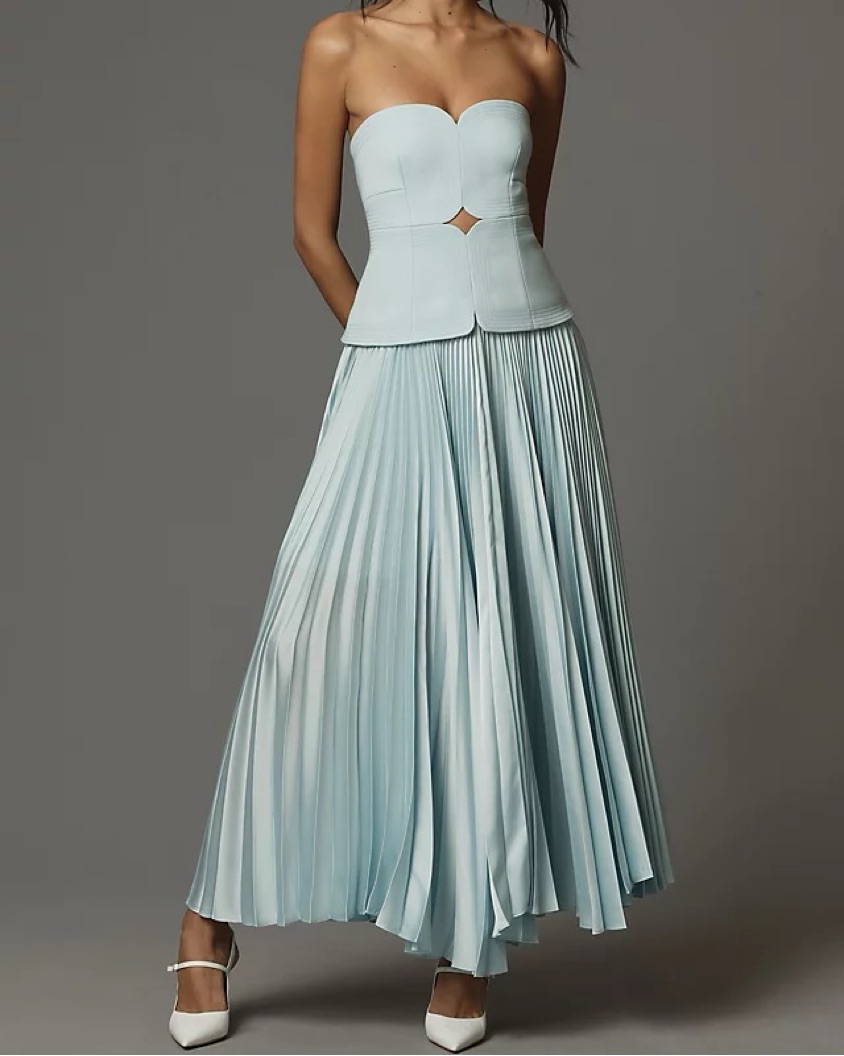 AU 8 / US 4 / S, but I wear XS / 2 and it also fits. A fresh take on a classic Acler silhouette ~ the Avonlea Corset Midi Dress in Celeste Blue features a modern bodice design, complimented with signature pleated fabrication. Structured bodice with a square neckline compliments a free flowing skirt.
