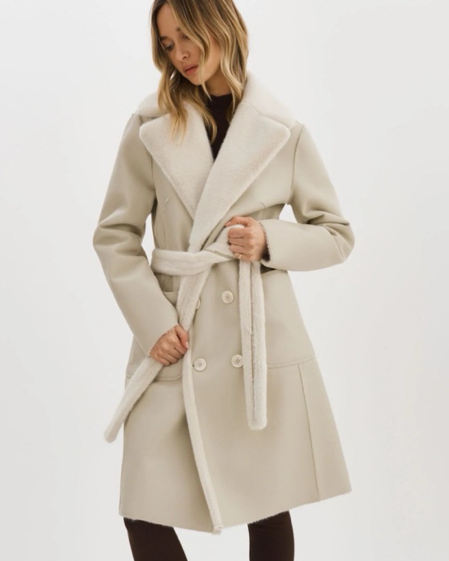 It’s a light grey faux leather that reverses into a white faux fur. It’s super cute (layering is recommended beneath)