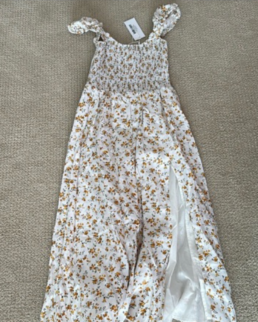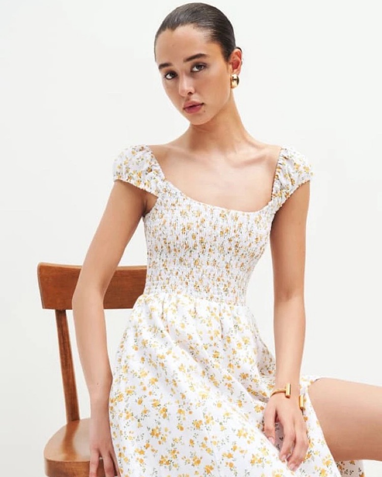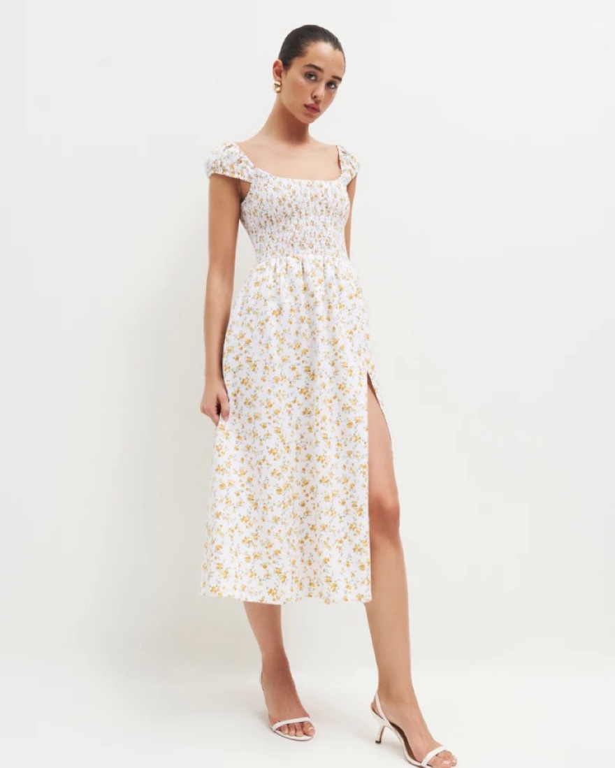 Reformation Tavi Linen Midi Dress. Gorgeous linen dress in a yellow floral pattern. Perfect for picnics, Europe summer, or a cute dinner. Pair with sandals and some cuffs. Capped sleeves with a smocked bodice. This dress has a side slit. Open to offers.