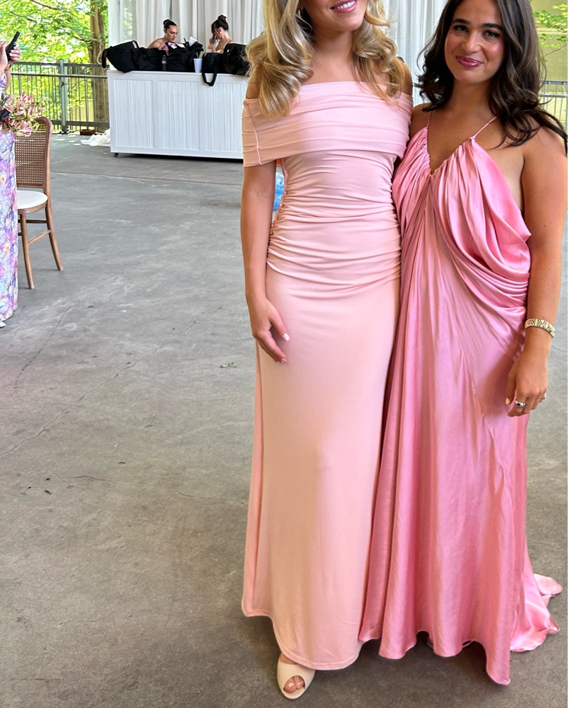 Size small meshki cassandra dress. Currently sold out. Stretchy material best for size 2/4. The dress was adjusted to have ruching added on the torso. Perfect dress for summer wedding… so flattering and comfy. So many compliments. Bottom was hemmed to fit myself (5’6 with heels)