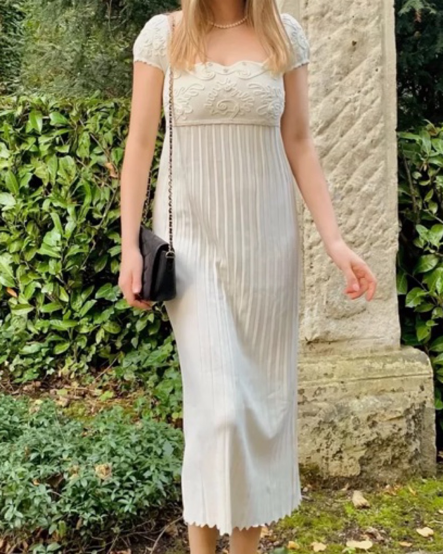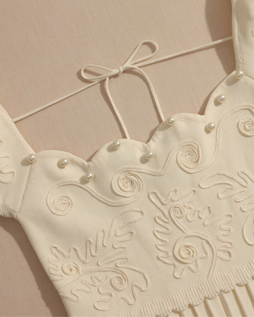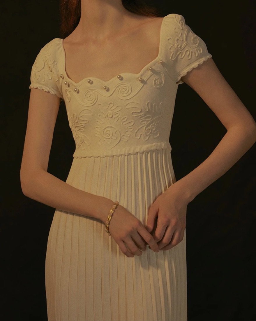 White long dress with square neck and pearl details