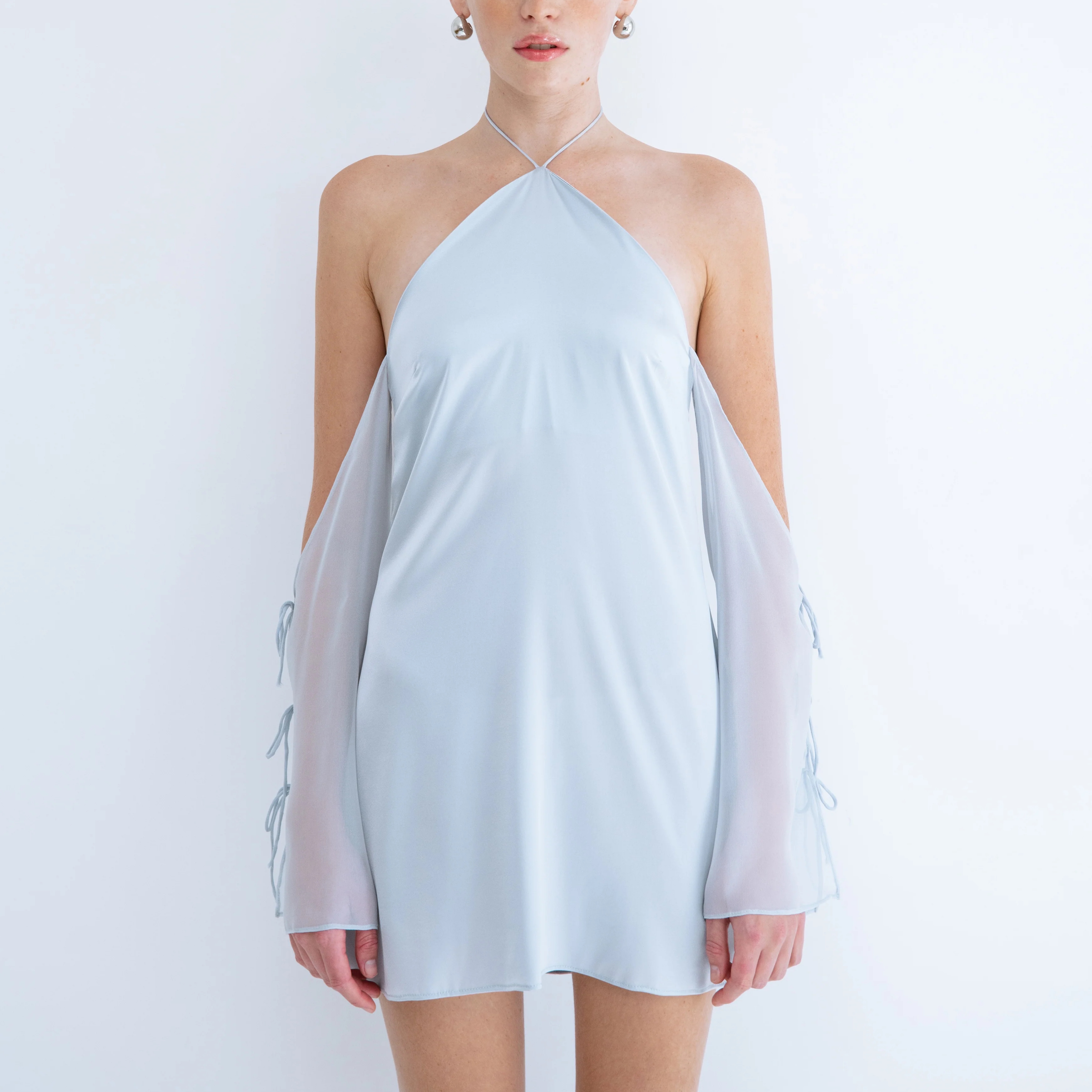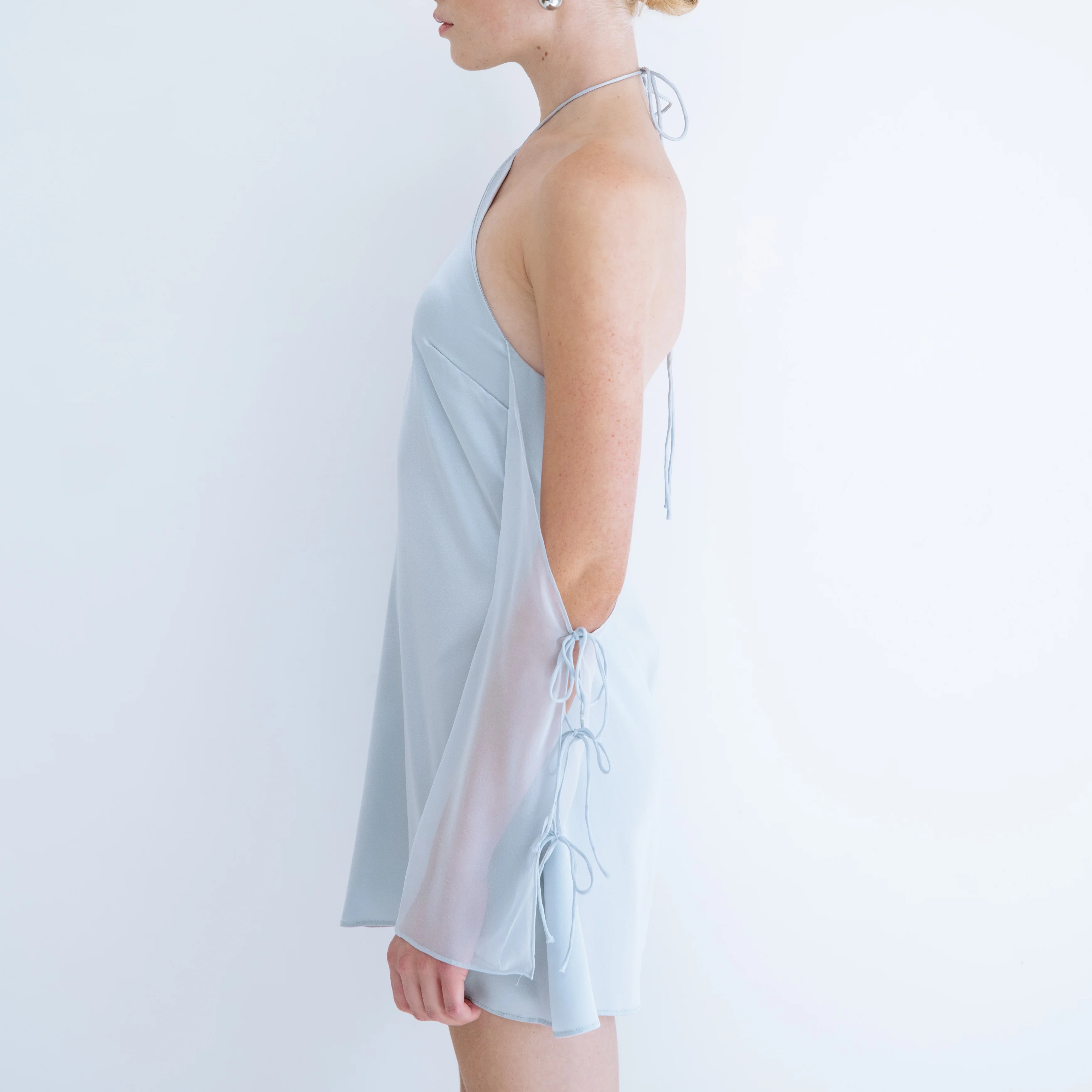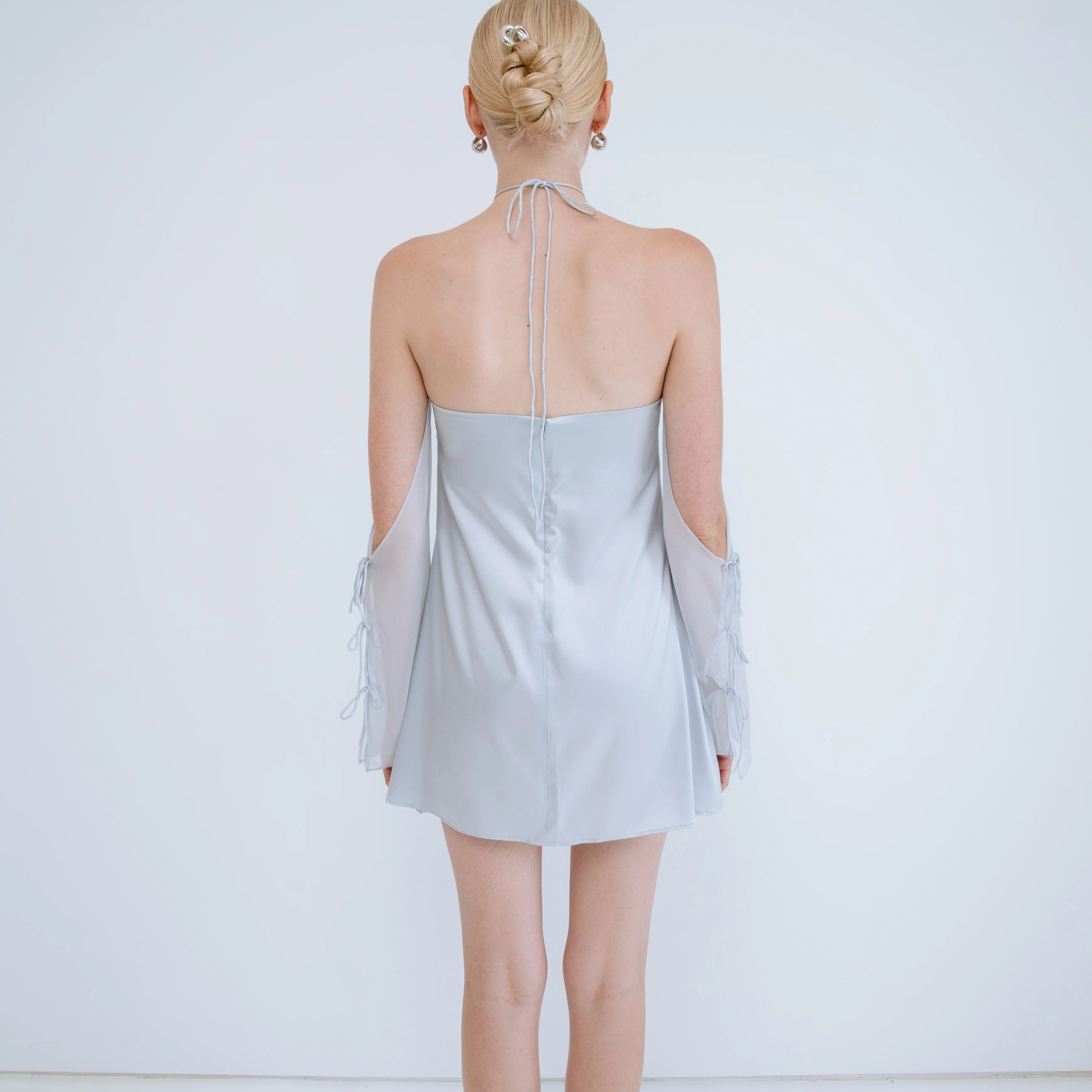 Never worn before:) steel color, silk stretch, halfer neckline