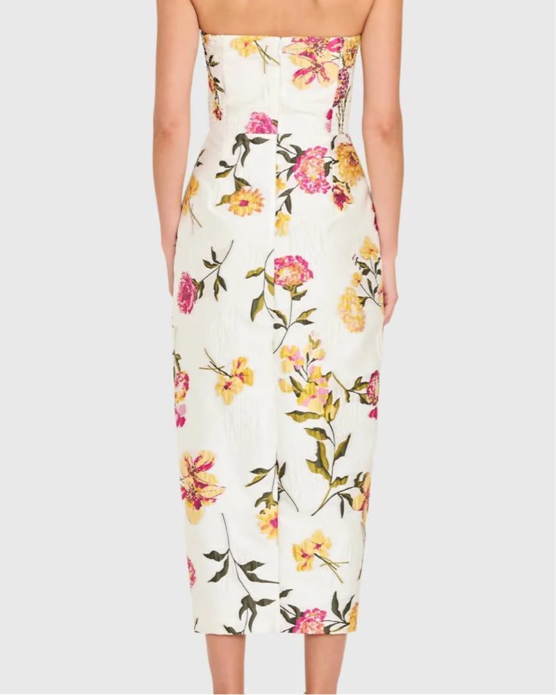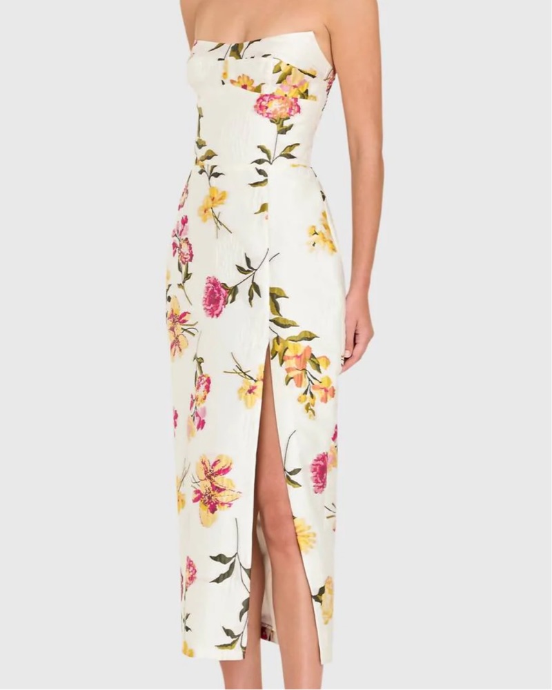Elegant white midi dress featuring pink and yellow floral print. Feminine split skirt for a flattering silhouette. Lightweight fabric with a refined finish. Perfect for daytime events and garden parties. Just add slides or mules and you are good to go. Introducing the Ivy Strapless Midi Dress by Ama