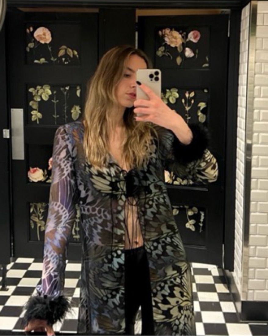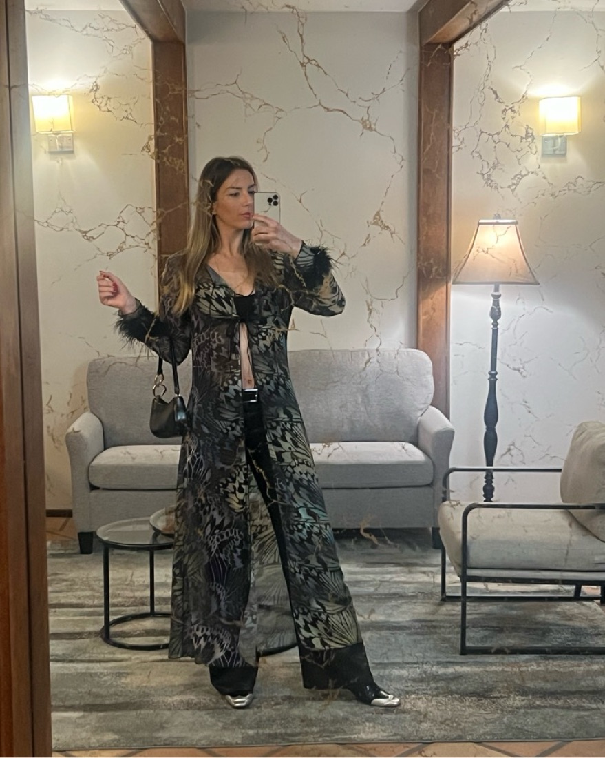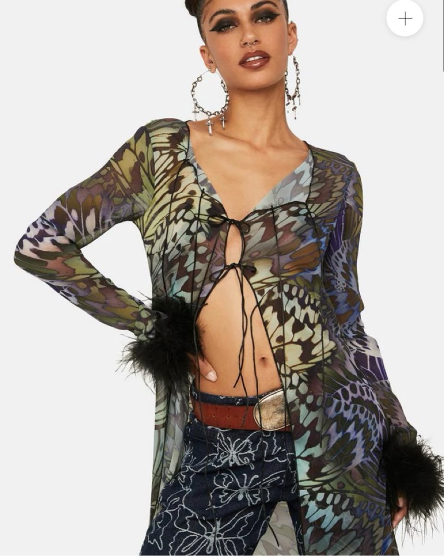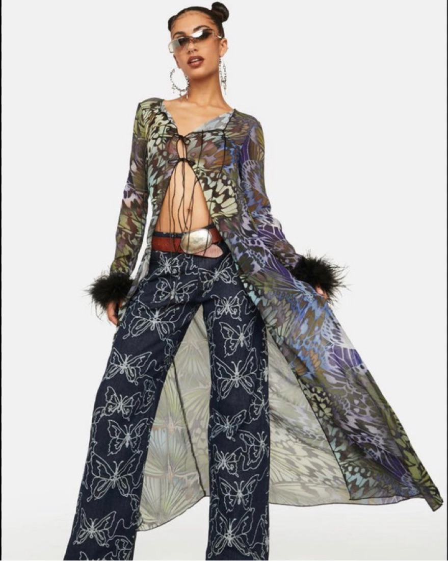 Jaded London Volare Lace-Up Butterfly Duster let's go to wonderland, babe! It has real feather trim cuffs that can be detached, strappy tie front closures, and a butterfly print all over. Perfect for festivals, the beach as a fancier cover up or pair with jeans for an edgier vibe!