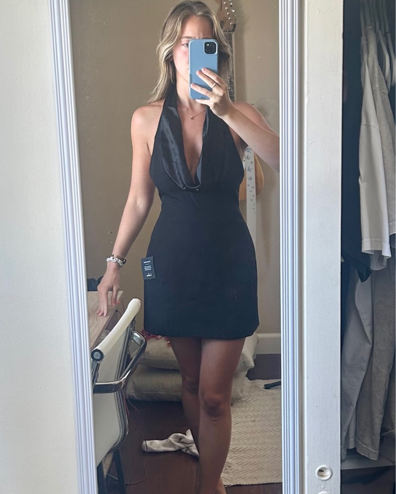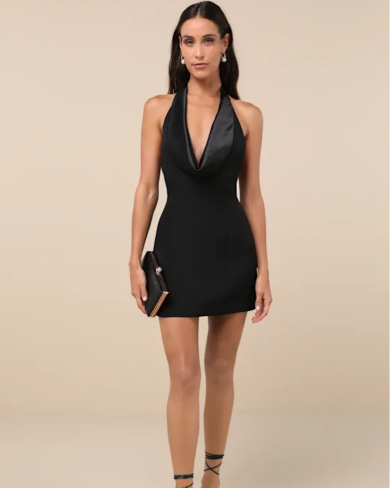 Lulus Perfected Finesse Black Cowl Halter A-Line Mini Dress. Sleek woven fabric shapes this luxe little dress that has a glossy, satin-trimmed tying halter neckline, flows into a plunging cowl bodice. Open back design completes the look. Hidden back zipper/clasp. Worn once to bachelorette. Size S.