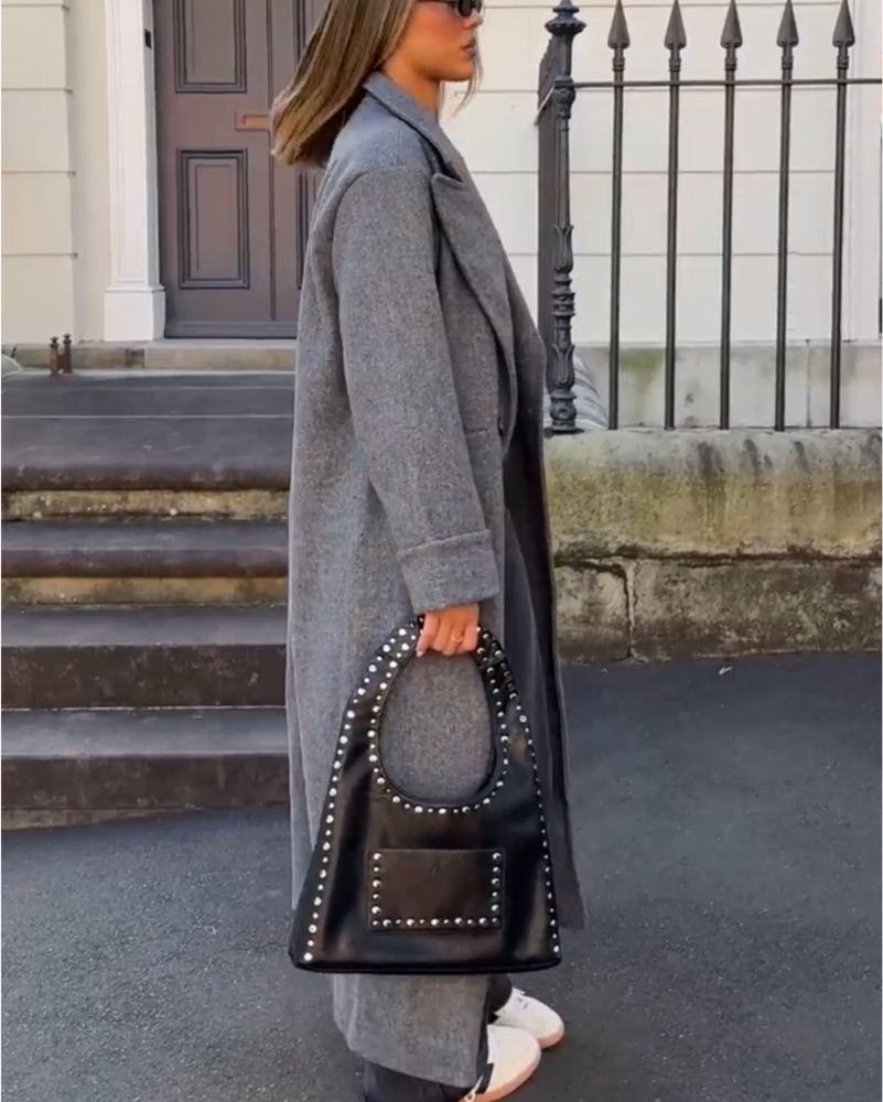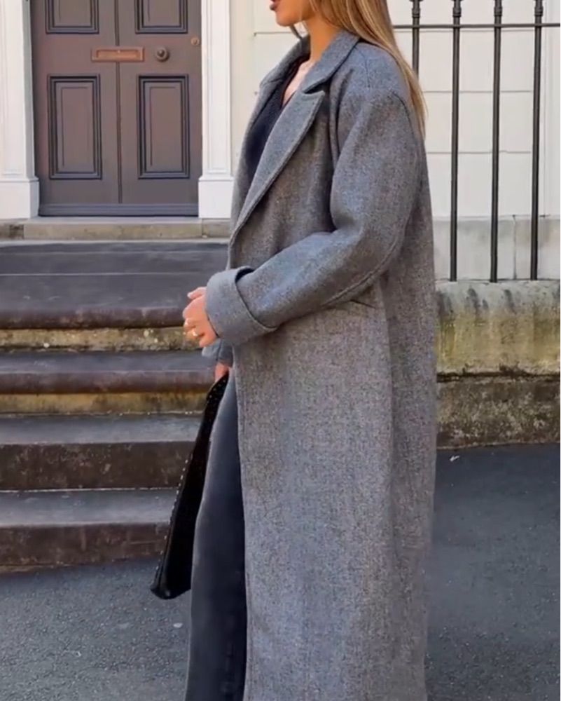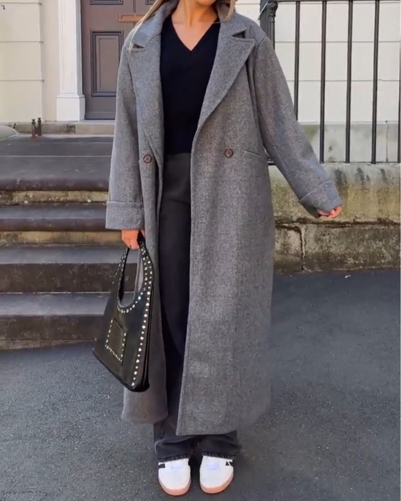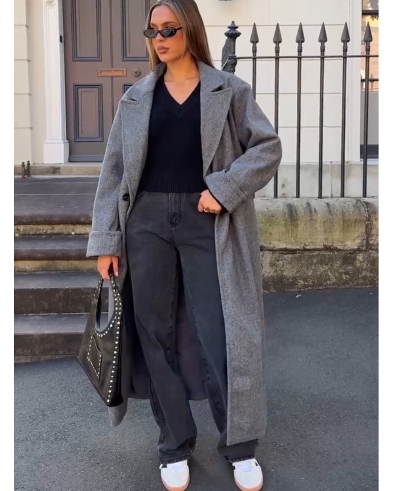 Grey oversized trench coat. Amazing quality and goes with everything , you can dress it up or dress it down