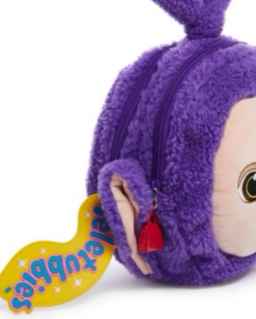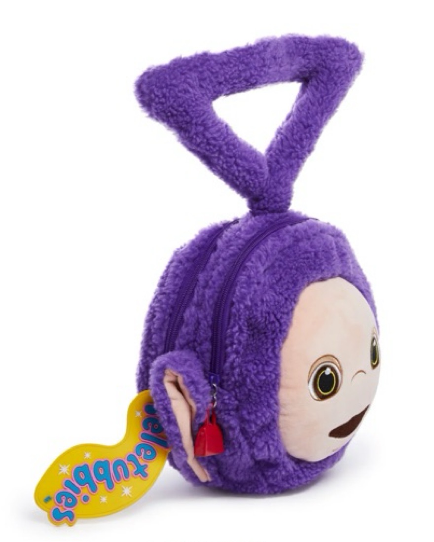 Cutest purple fuzzy plush Tinky-Winky shaped handbag from Dollskill. Features an embroidered face design on the front, ears on the sides, an antenna top handle and double top zipper closures. Each zipper features a different charm: a rubber Teletubbies logo and a red metal purse charm. Brand new!