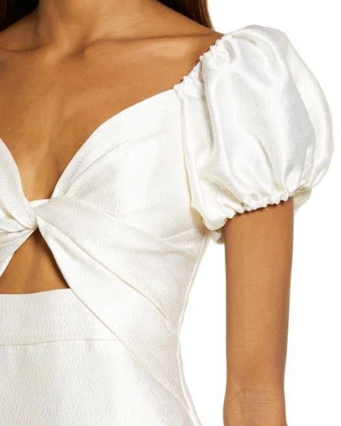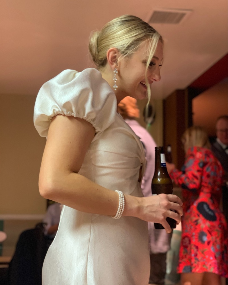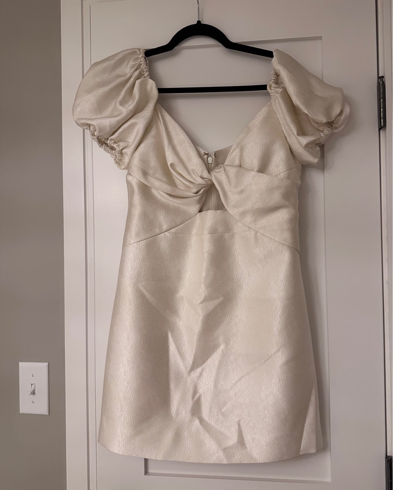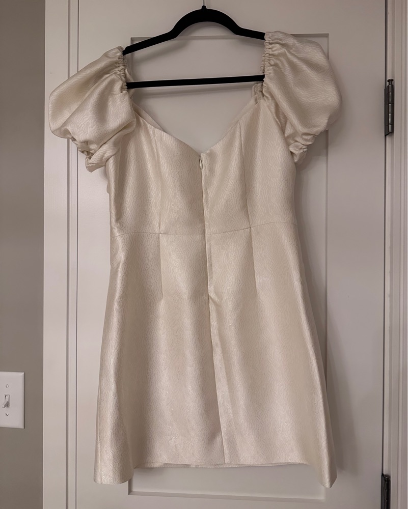 Wore this dress for my wedding after party and had it dry cleaned after. Super fun and flattering cut. The 4th photo is me wearing it. I purchased as a size 10 and had it tailored to a size 4/6 (was 145 lb, 32DD and 5’3” at the time).