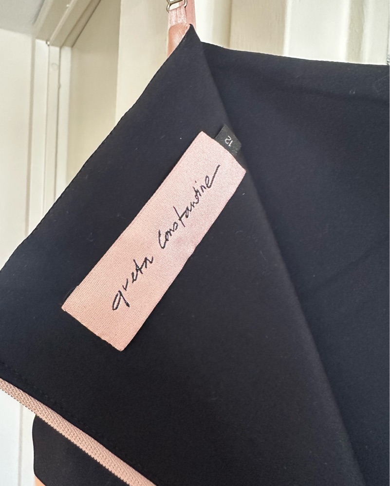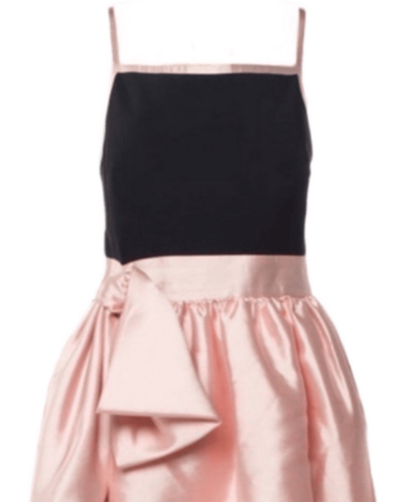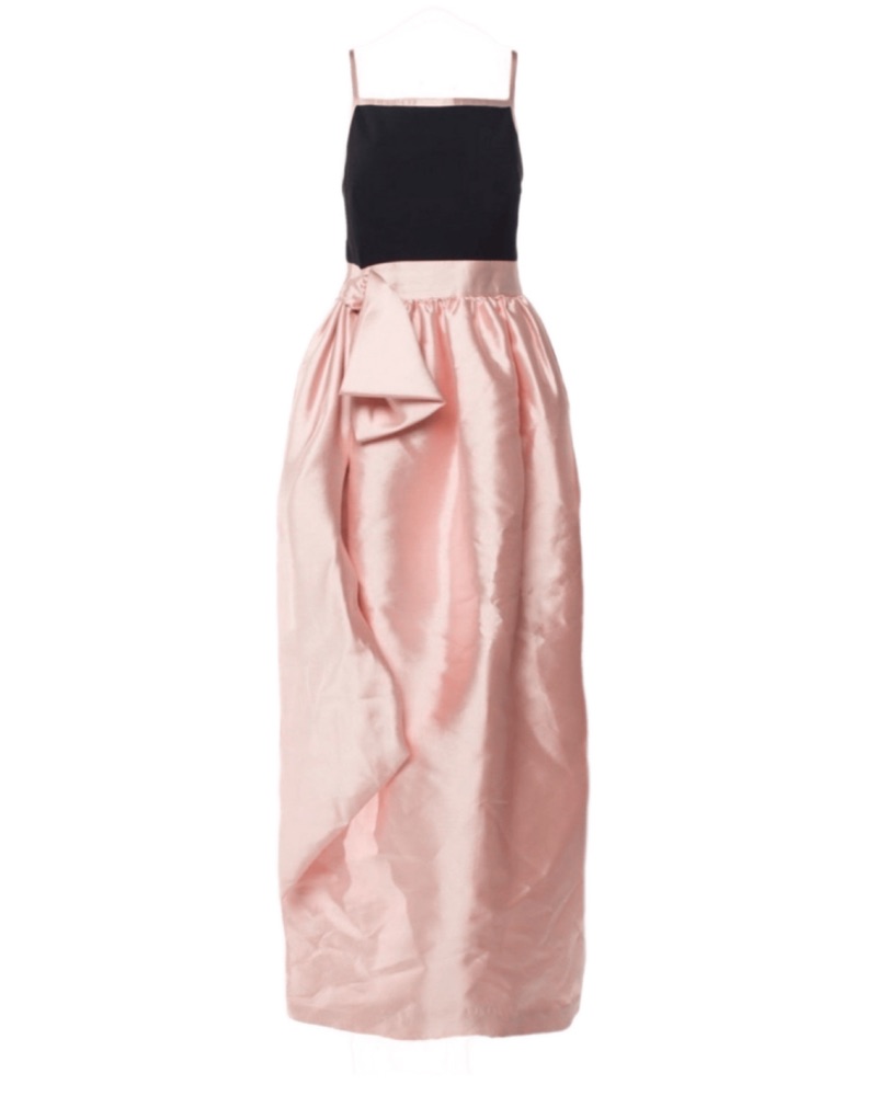 Gorgeous pink and black gown. The flat measurement of the waist is 17.5” and the fabric at the bust has stretch. The dress is in excellent condition with no visible signs of wear
