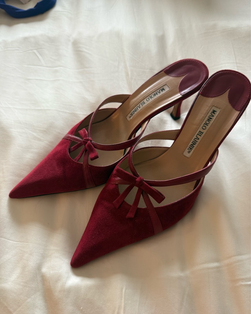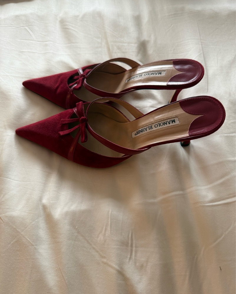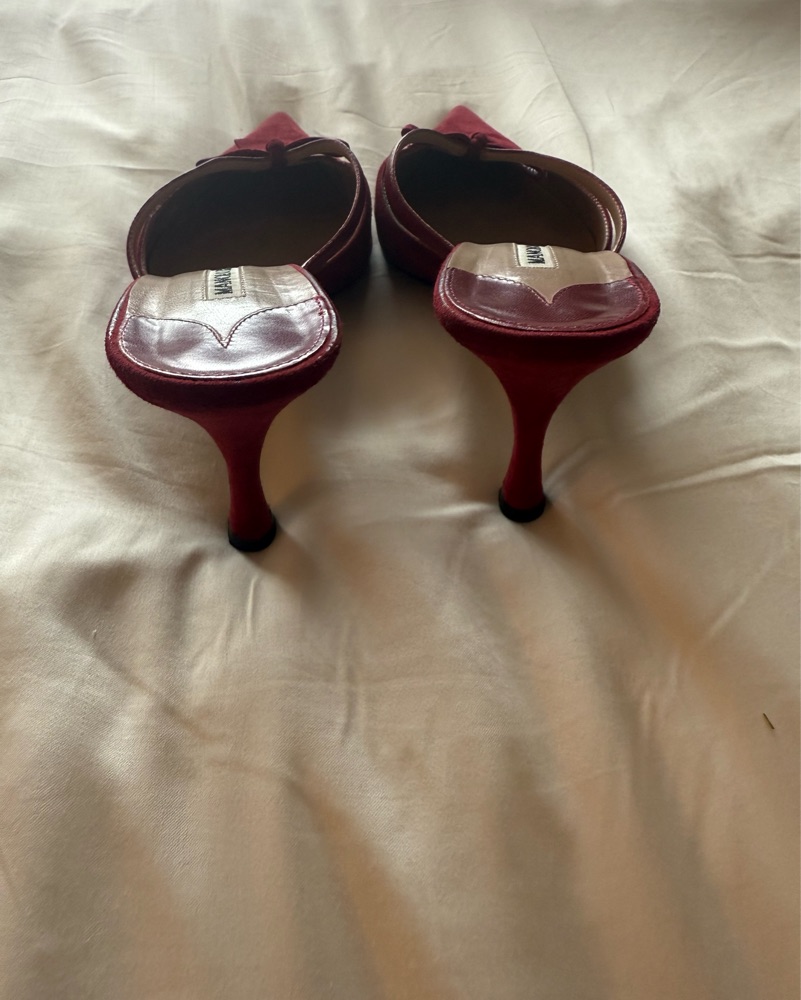 These striking dark red suede mules are perfect for a night out or a formal event. The sleek pointed toe and thin stiletto heel lend an air of sophistication. Size 39, manolo runs small