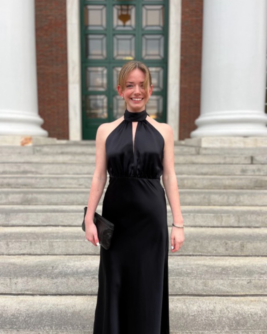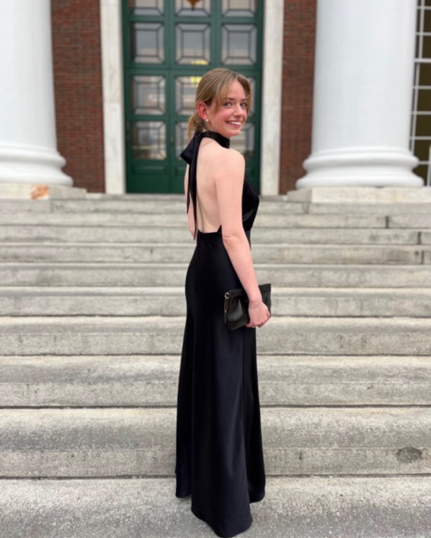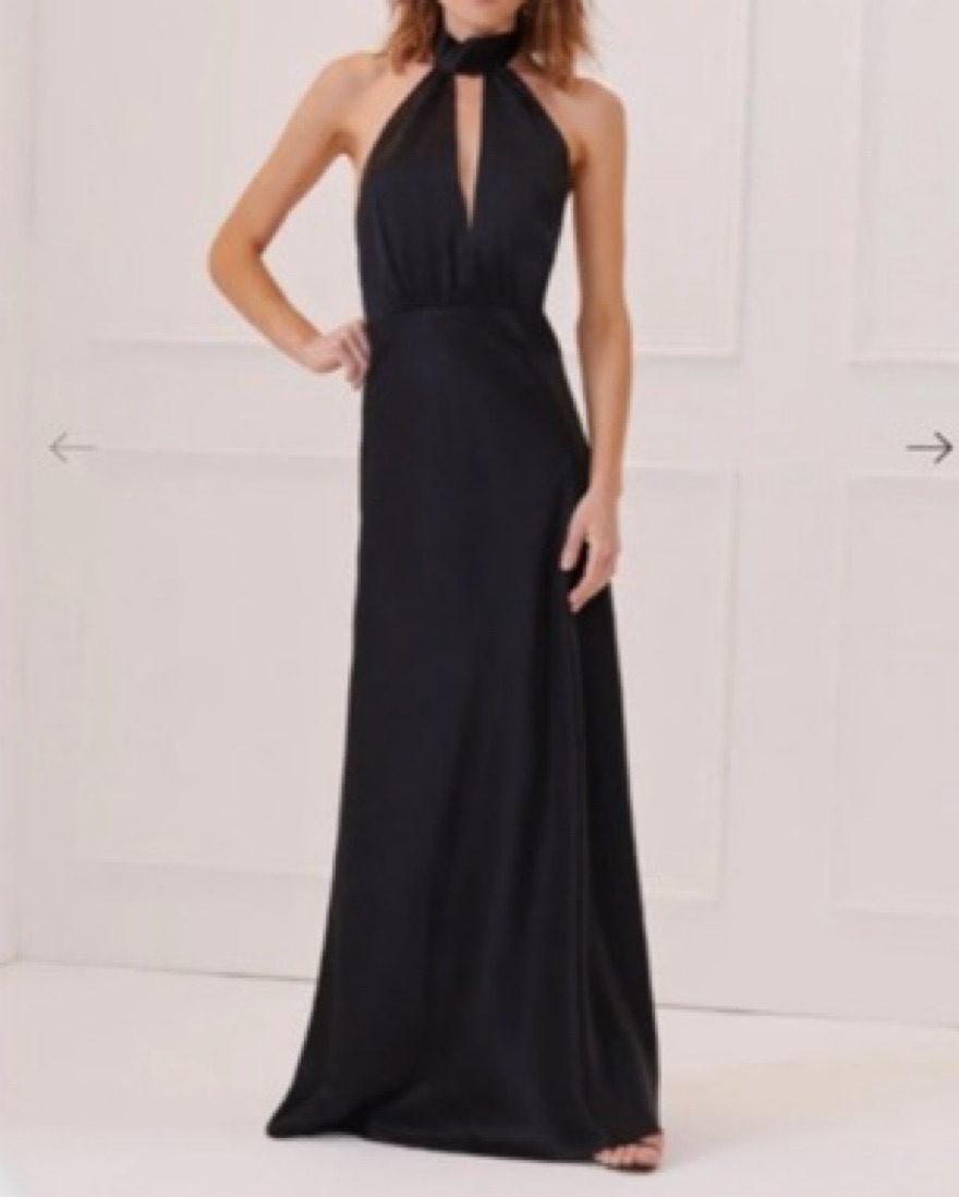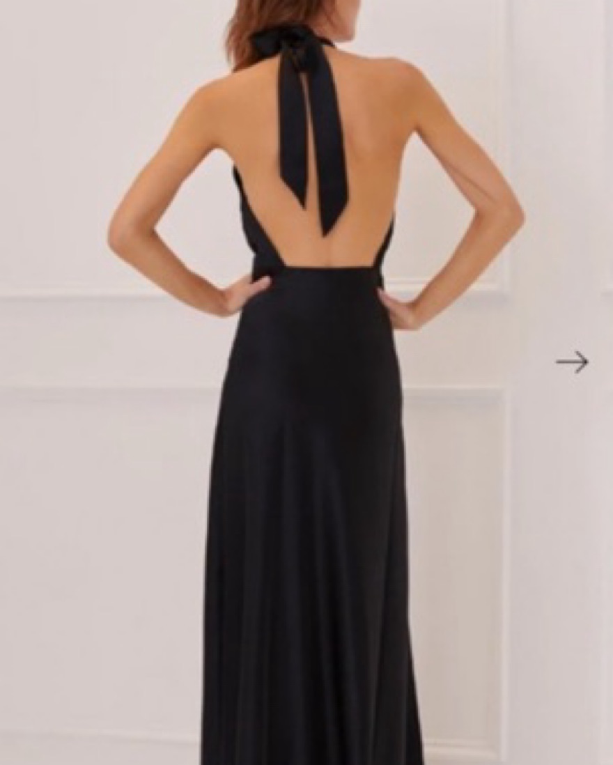 Classic black tie dress. Slightly altered to tighten bust and shorten length to accomodate 3.75” heels and 5’4 height, and B cup bust