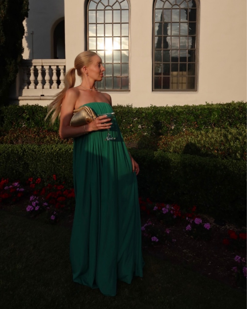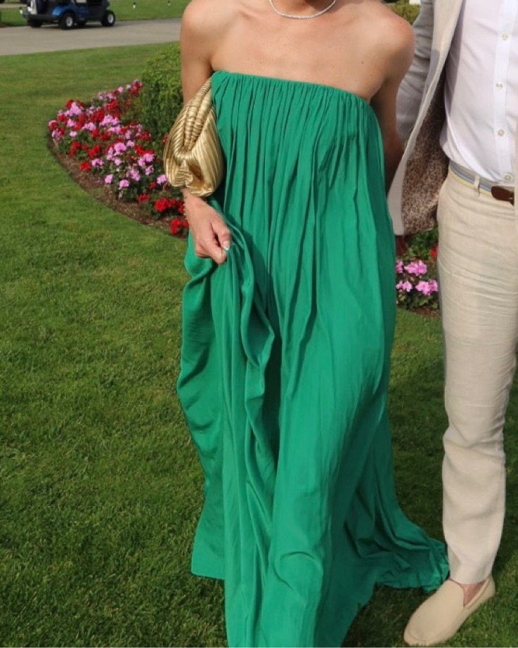 This stunning emerald green gown is perfect for any formal occasion. The flowing, floor-length silhouette and golden accents create a luxurious, sophisticated look.