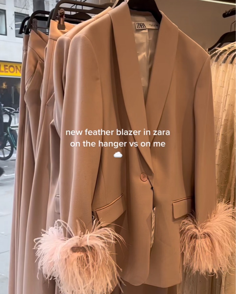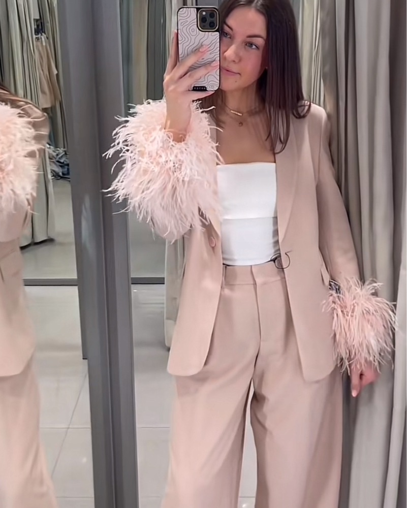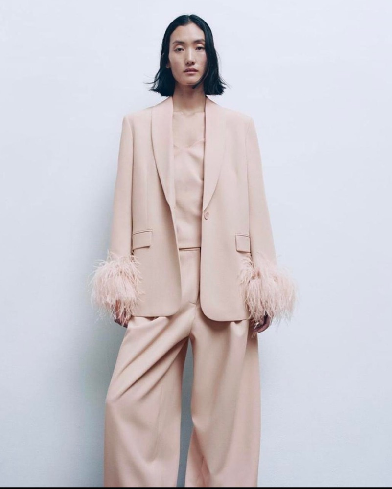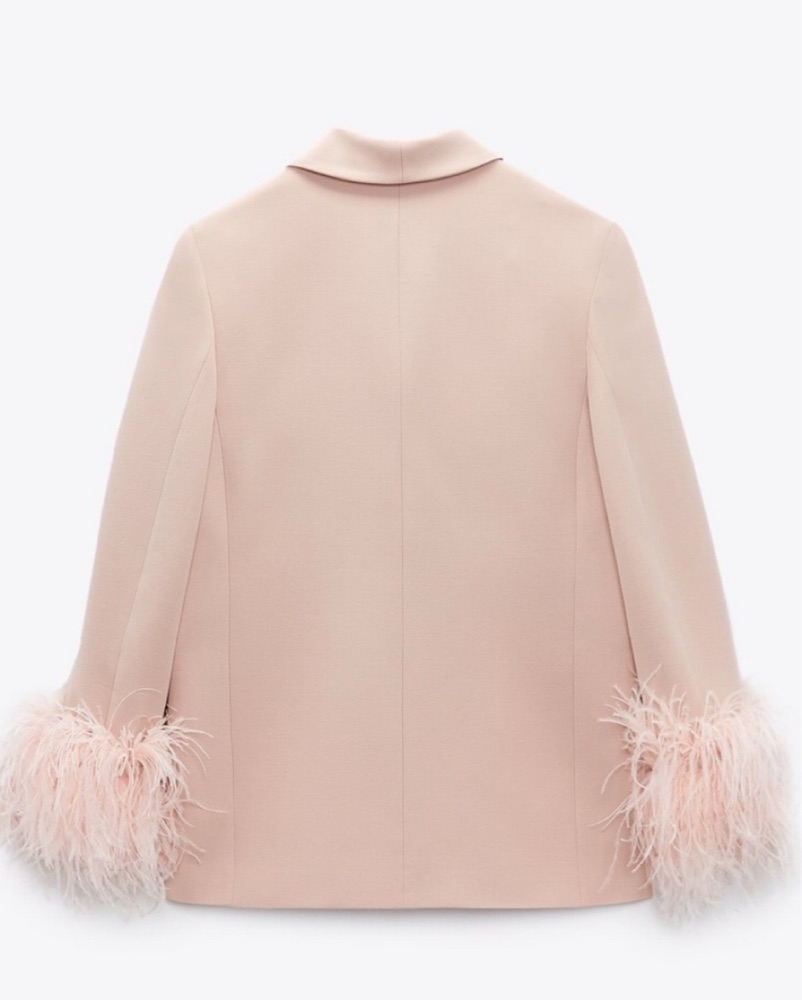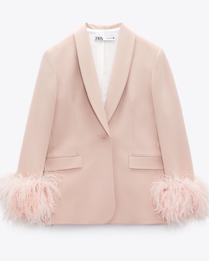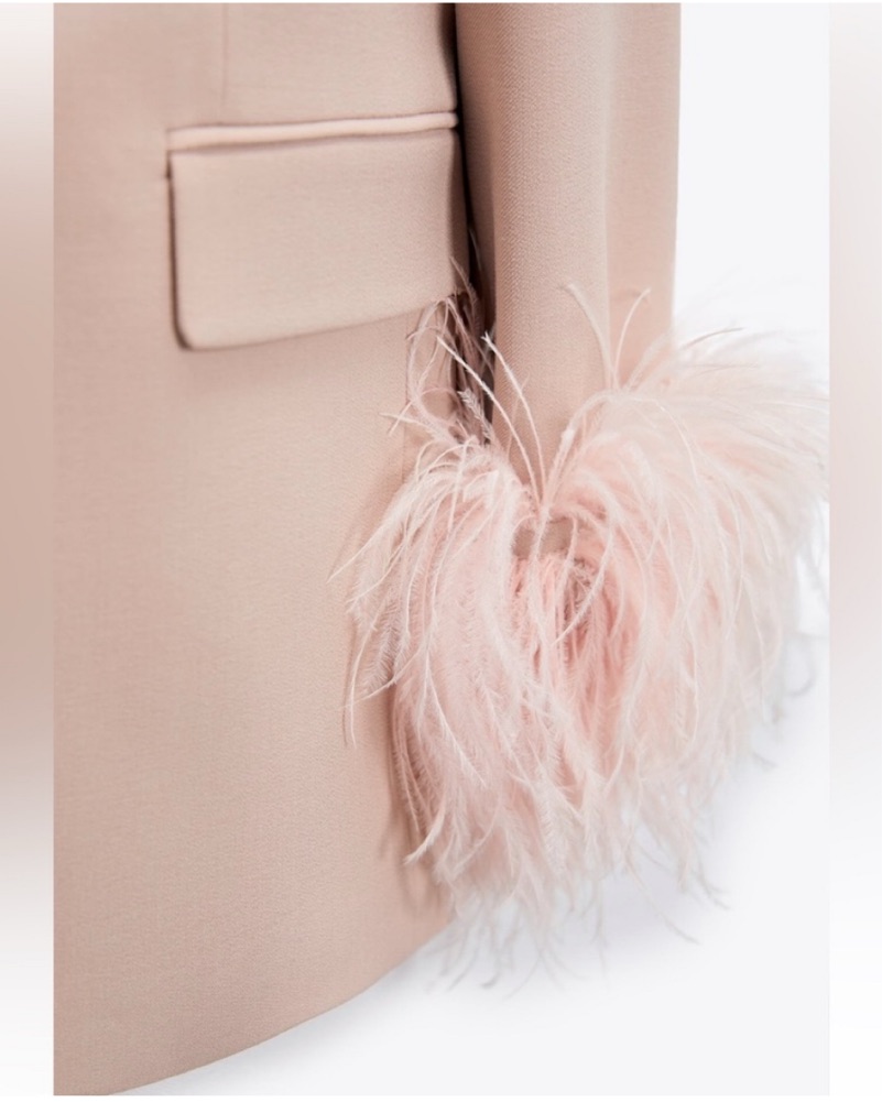 This blush-toned oversized blazer from Zara features a chic feathered trim on the cuffs, adding a touch of glamour to any outfit. Pair it with sleek trousers or a flowing dress for a stylish look perfect for a night out. *DRY CLEANING REQUIRED PRIOR TO RETURNING*