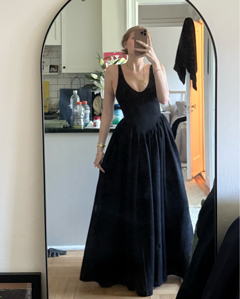 Heavyweight jersey. Stretchy. Rib texture. Can be casual(ish) or very dressed up. Has soft underwire but not restricting. Soooo comfy. Drop waist & so flattering. 33” from shoulder. Touches floor on me and I’m 5’7”