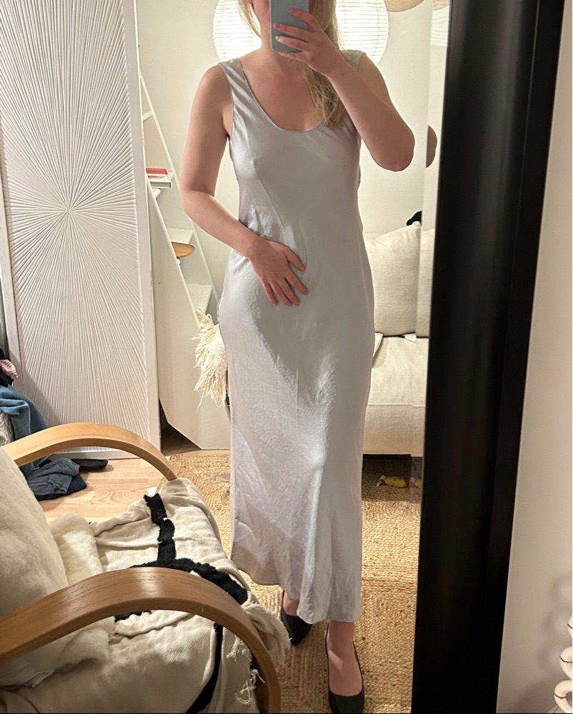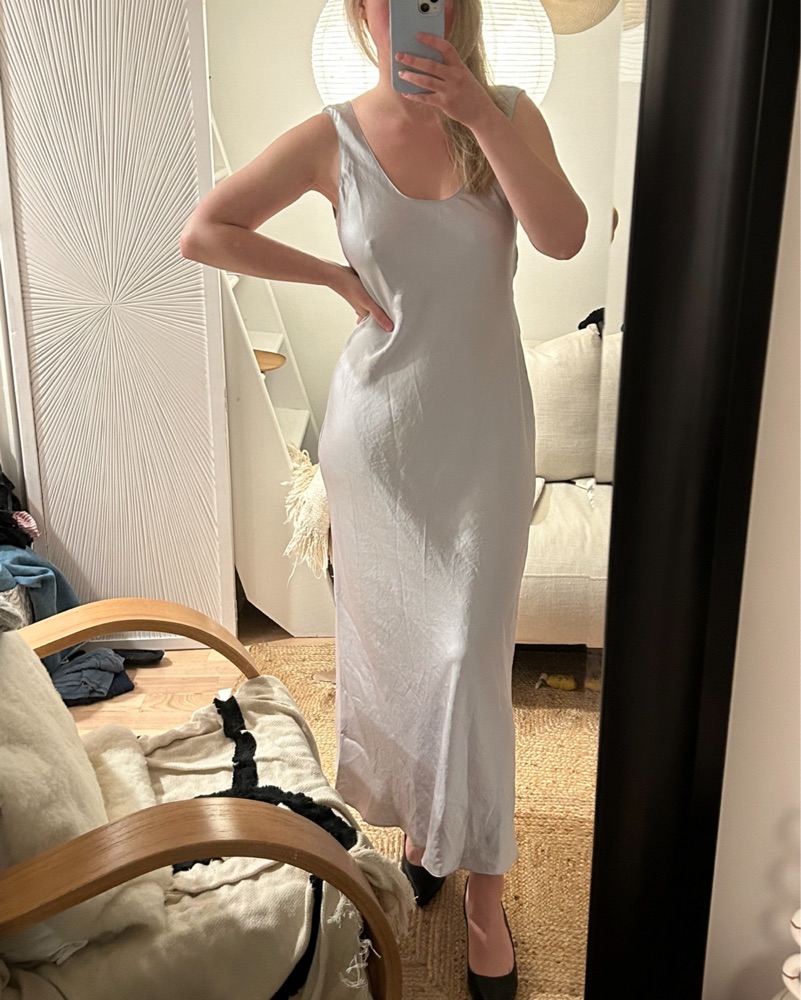 This sleek satin slip dress is perfect for evening events and special occasions. Its flattering silhouette and luxurious fabric make it a sophisticated choice.