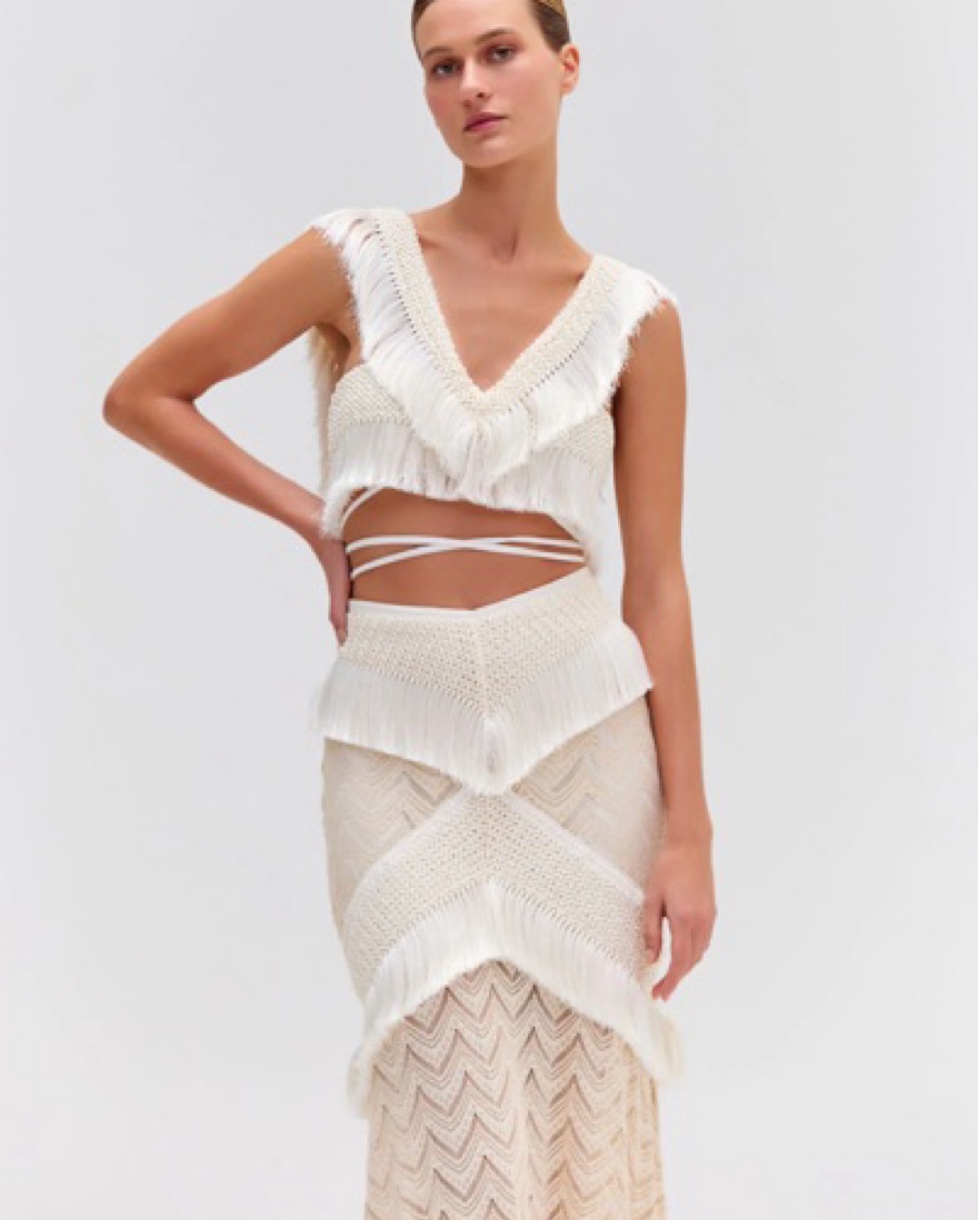 Top - Size 4 Bottom - Size 6. Completely sold out. runs smaller. made from a stretch Modal lace fabric and features hand-applied fringe trim details throughout. Fully lined. Concealed back zipper closure