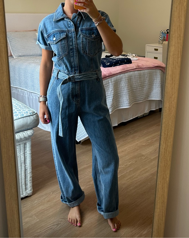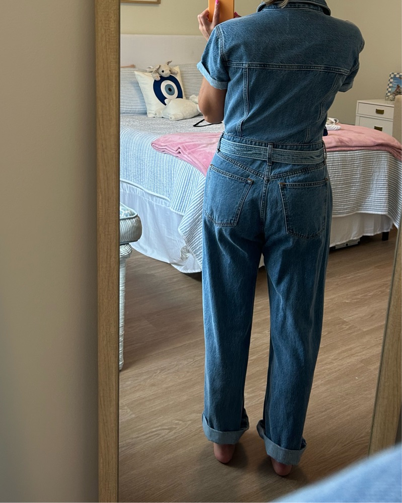 Small petite. Denim one piece jumpsuit. Oversized fit