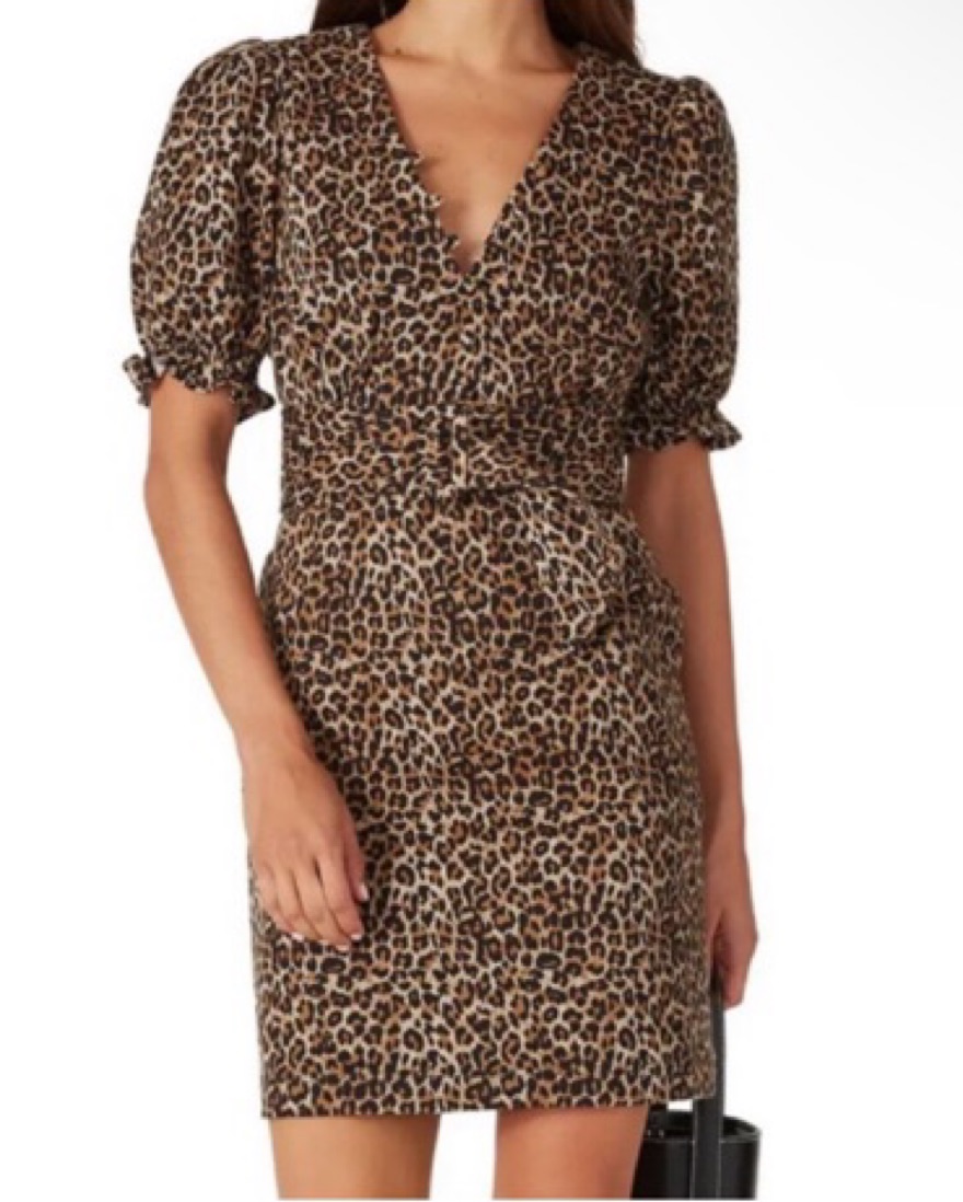 Structured Cheetah print denim-style mini dress Marissa Webb Sz 6! Belted style is so flattering!