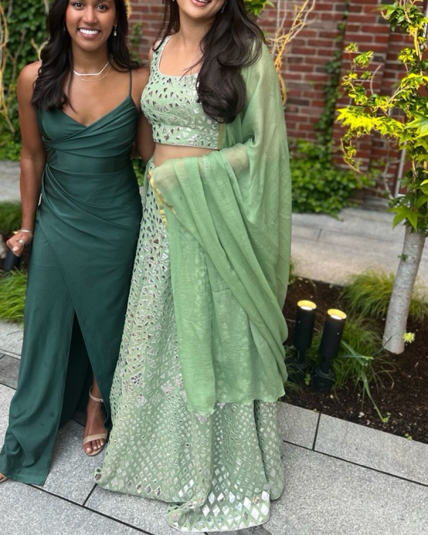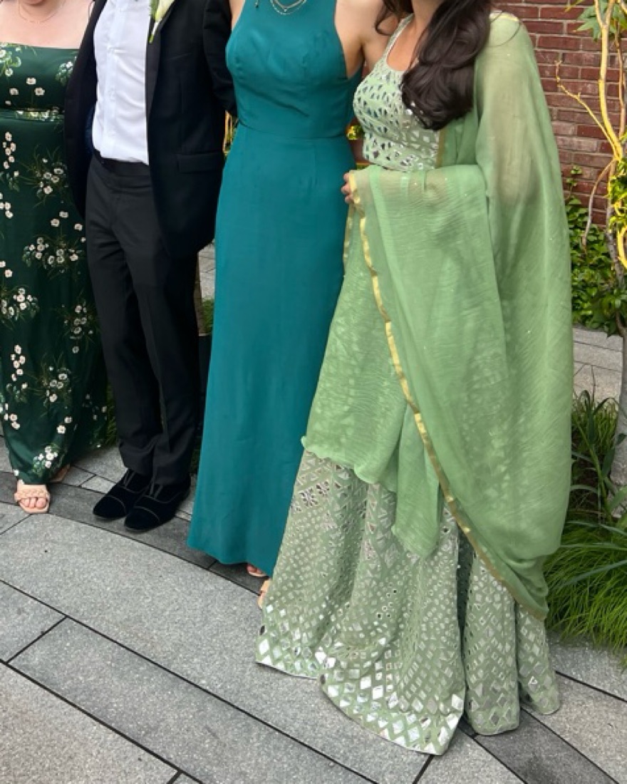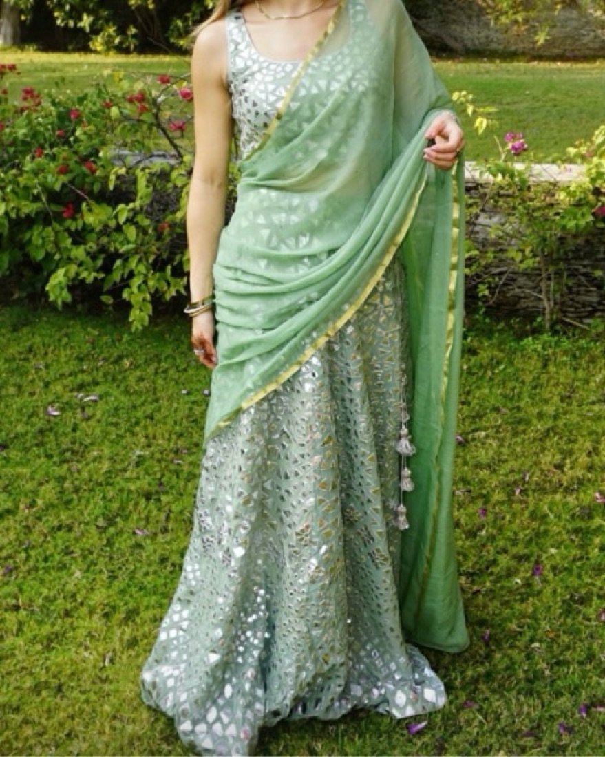 This mirror-work inspired metallic lehenga is perfect for any South Asian or Indian function. It comes with a sheer dupatta. Can easily be dressed up or down with accessories. Only worn once. Pleass message with questions!