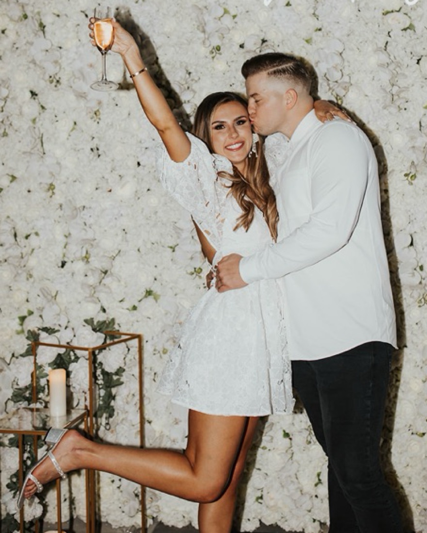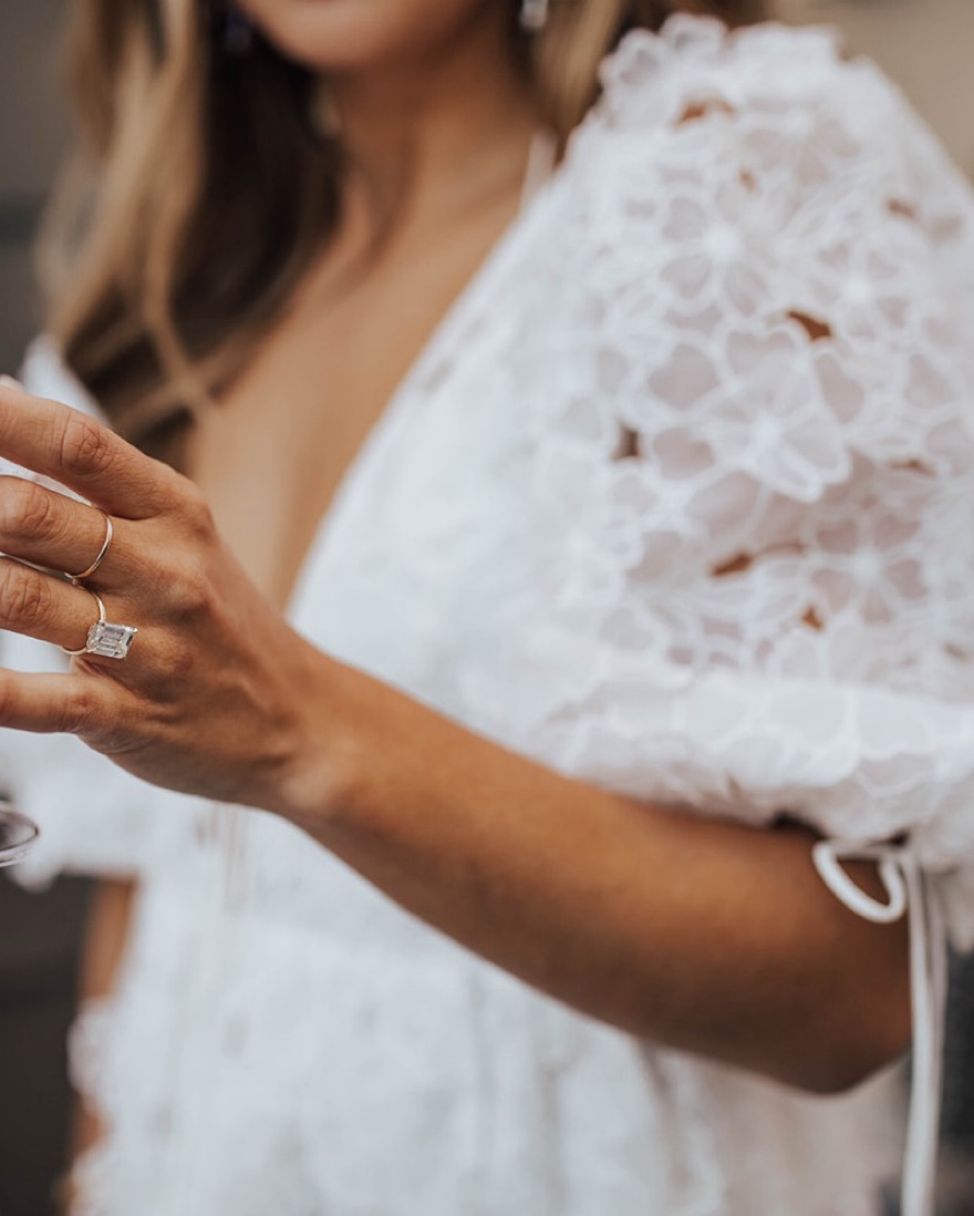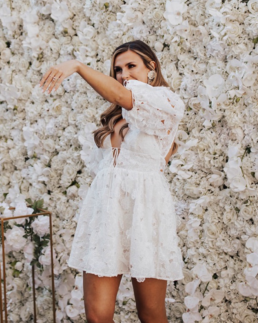This delicate, lace cocktail dress is perfect for any special occasion. The ruffled, off-the-shoulder silhouette and flowy skirt create a feminine, elegant look.