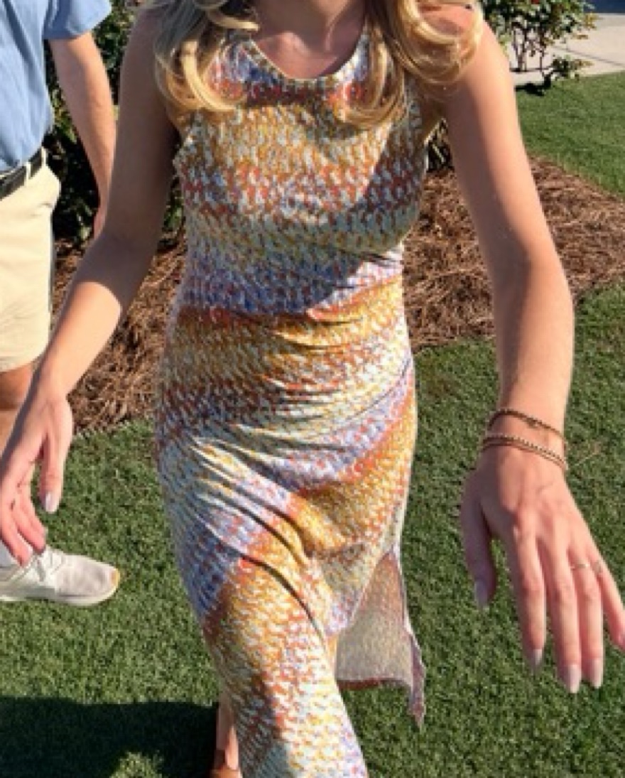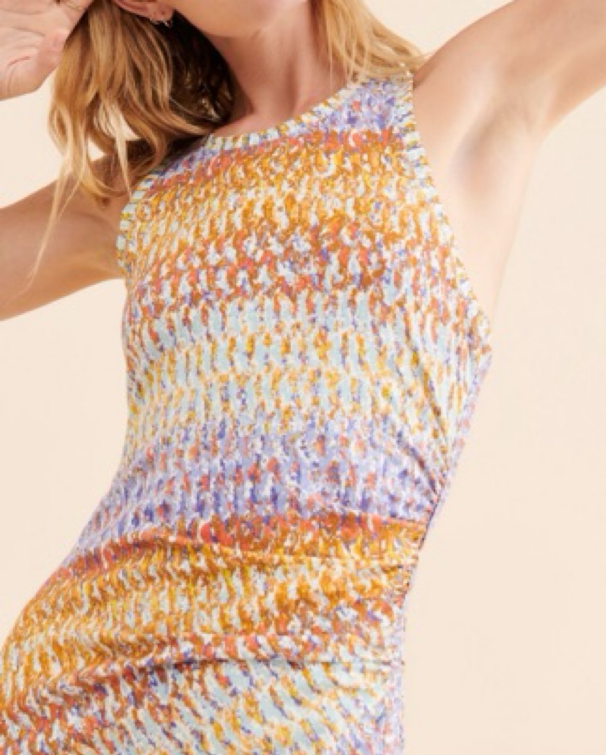 This stunning midi dress features a vibrant multicolored pattern that is sure to turn heads. It's the perfect piece for a summer party or special occasion.