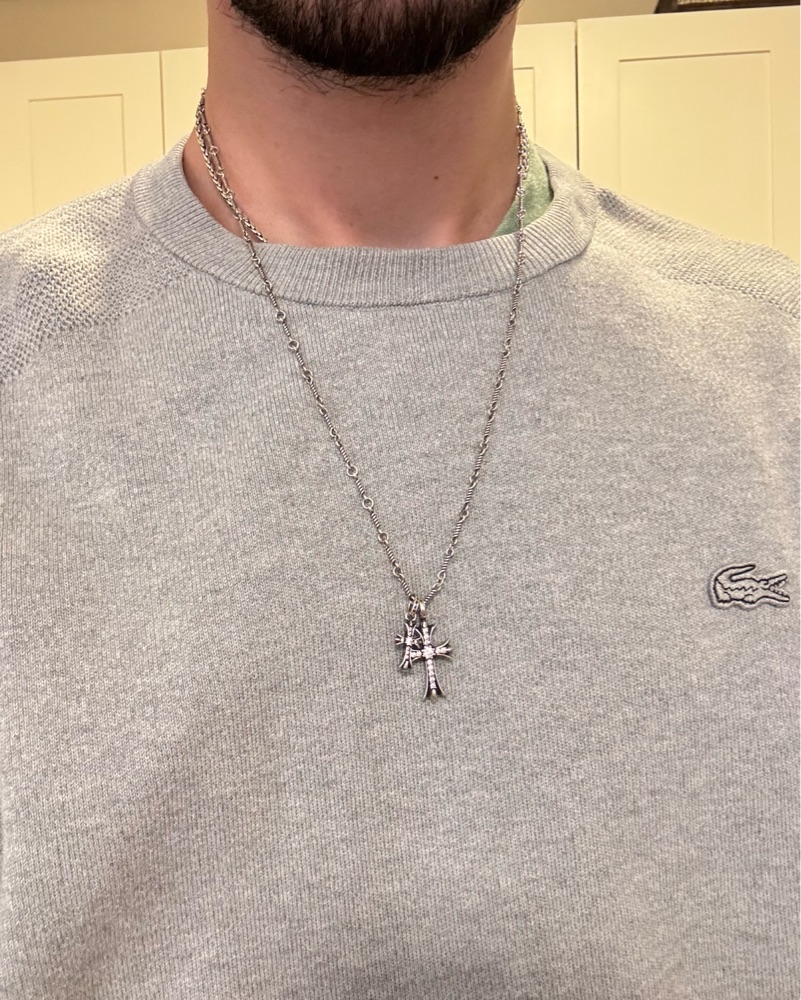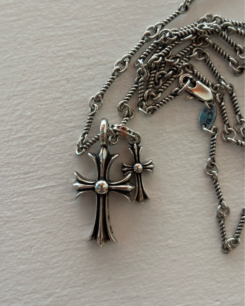 Chrome hearts necklace with 2 different pendants on it. Can be worn with either the diamond side or the other side facing out. The chain itself is 23 inches long. The intricate design and shimmering details make it a versatile accessory suitable for both casual and formal occasions.