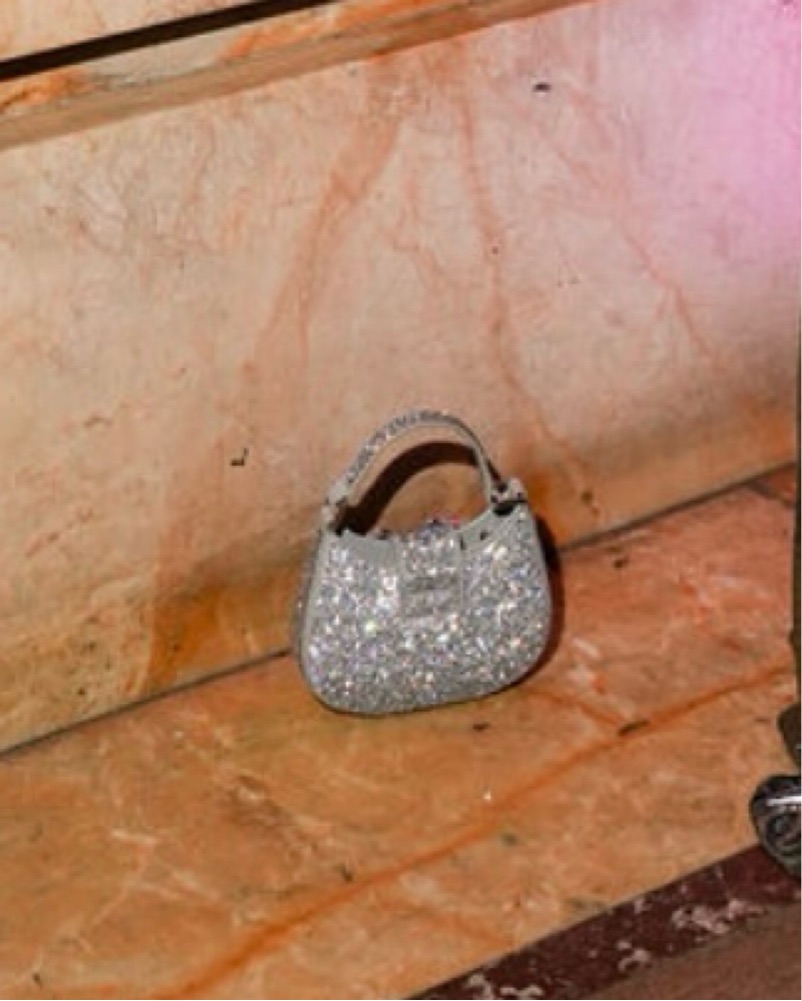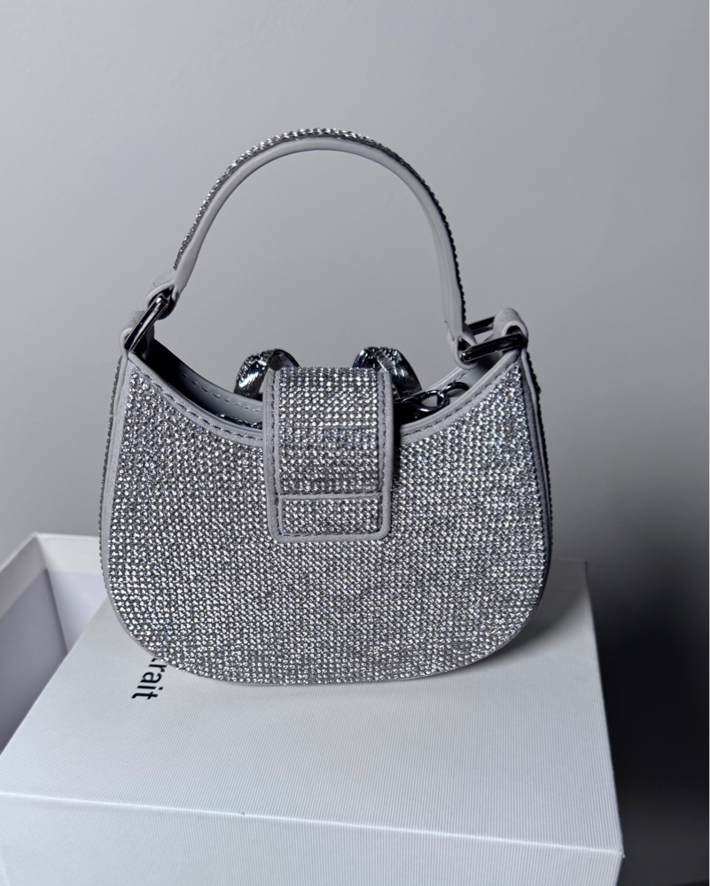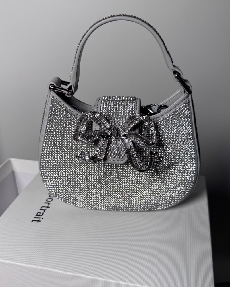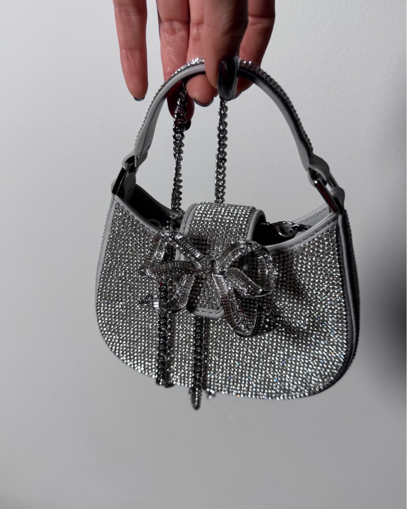 perfect accessory to elevate any outfit. The intricate rhinestone bow detailing adds a touch of glamour, making it a versatile choice for special events or a night out. Micro! Will fit maybe a wallet and one gloss