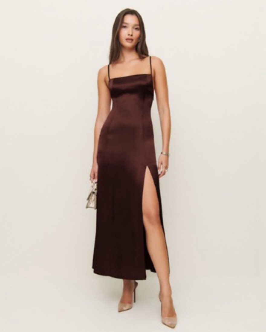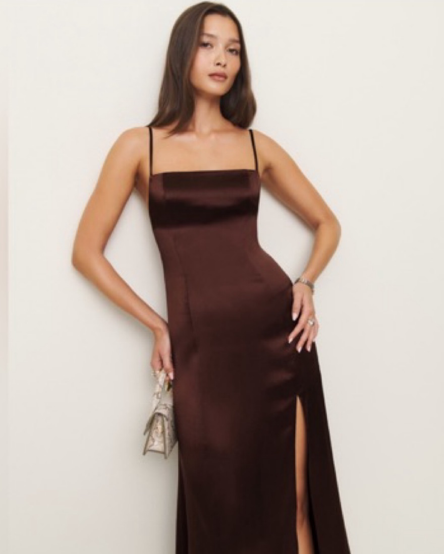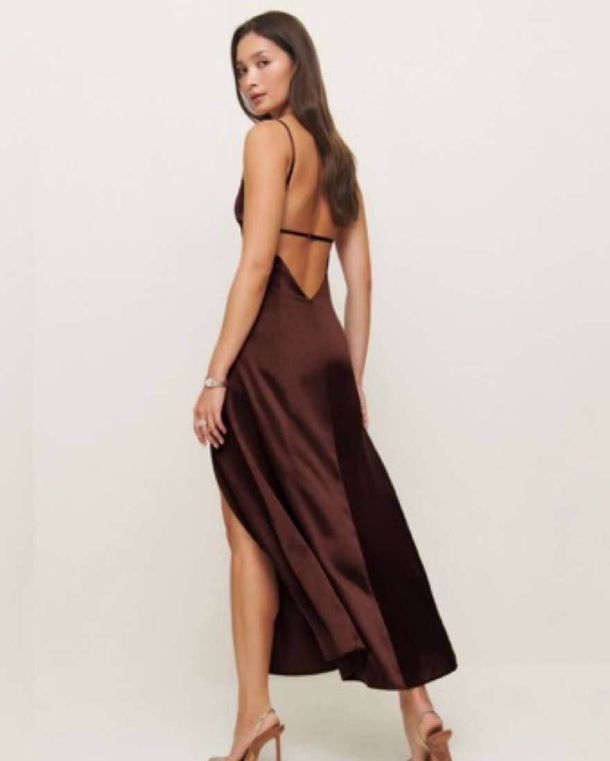 Reformation Melina Silk Dress Mahogany. Size 6, never worn! Scoop neckline, low back, with a side slit. Lined fabric. 100% silk. Red/brown color. Perfect for a formal/black tie wedding guest dress. This dress has never been worn!