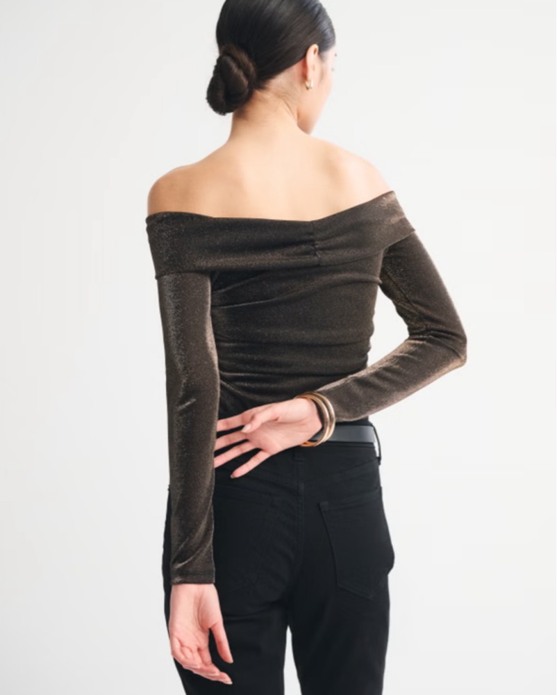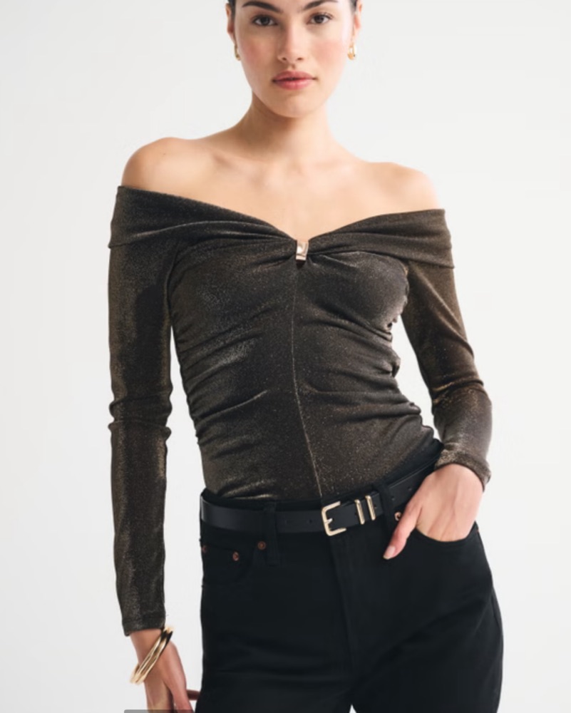 XS long sleeve Abercrombie & Fitch Black off the shoulder top with gold glitter and golf cuff detail.