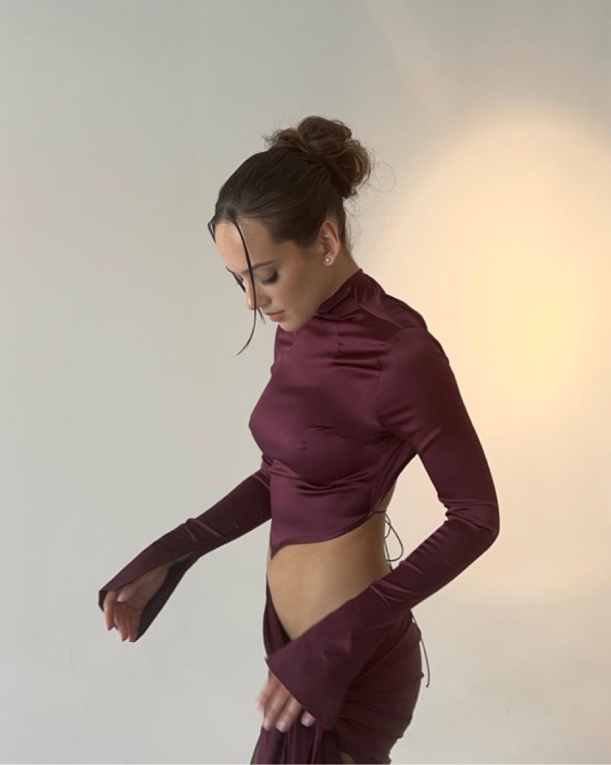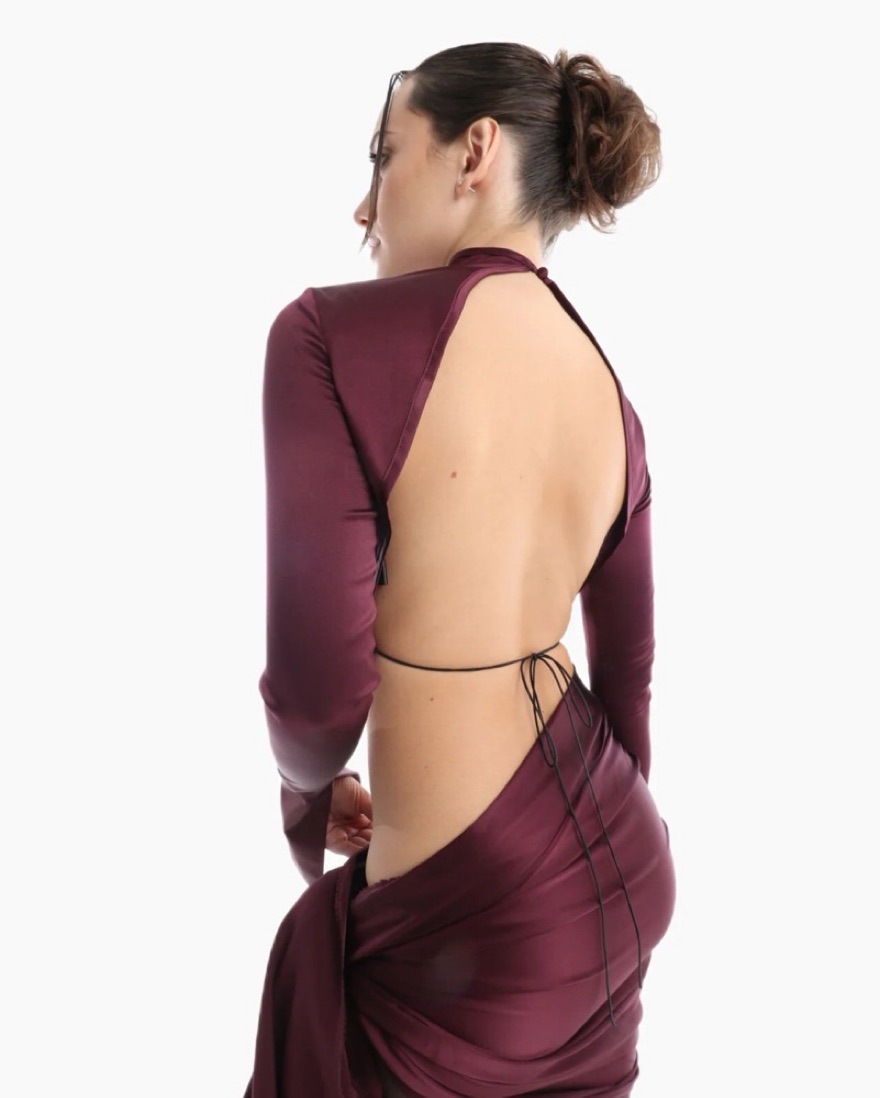 Amina top from Anomis studios. Plum color, 97% silk 3% spandex. Open back with tie to adjust. Perfect top for spring. Pair with a lowrise pant or a V cut skirt