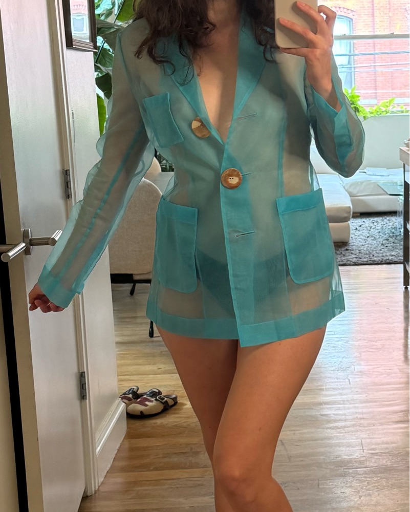 Sheer blazer by Rejina Pyo. Lightweight organza in bright turquoise. Oversized natural buttons, lapels, chest pocket. Longline silhouette, unlined and airy. Perfect for layering over slips, bralettes, or even swimwear.