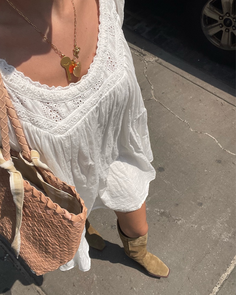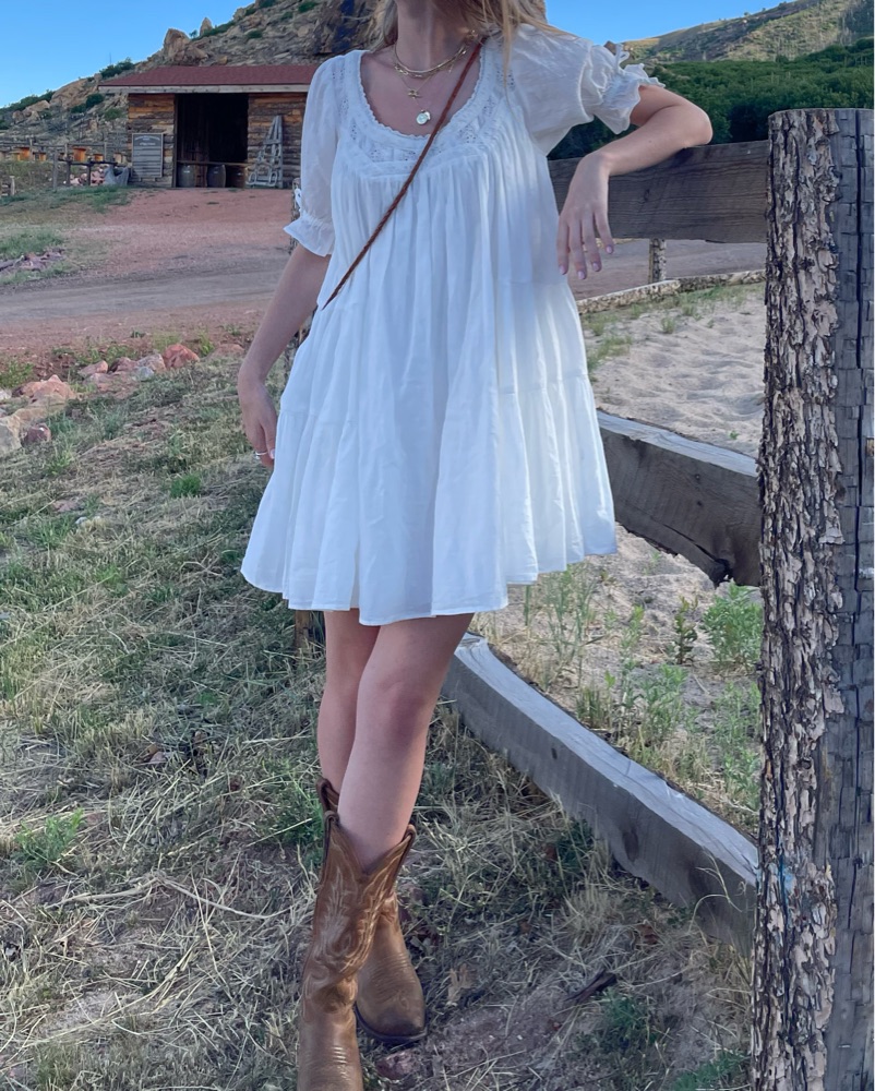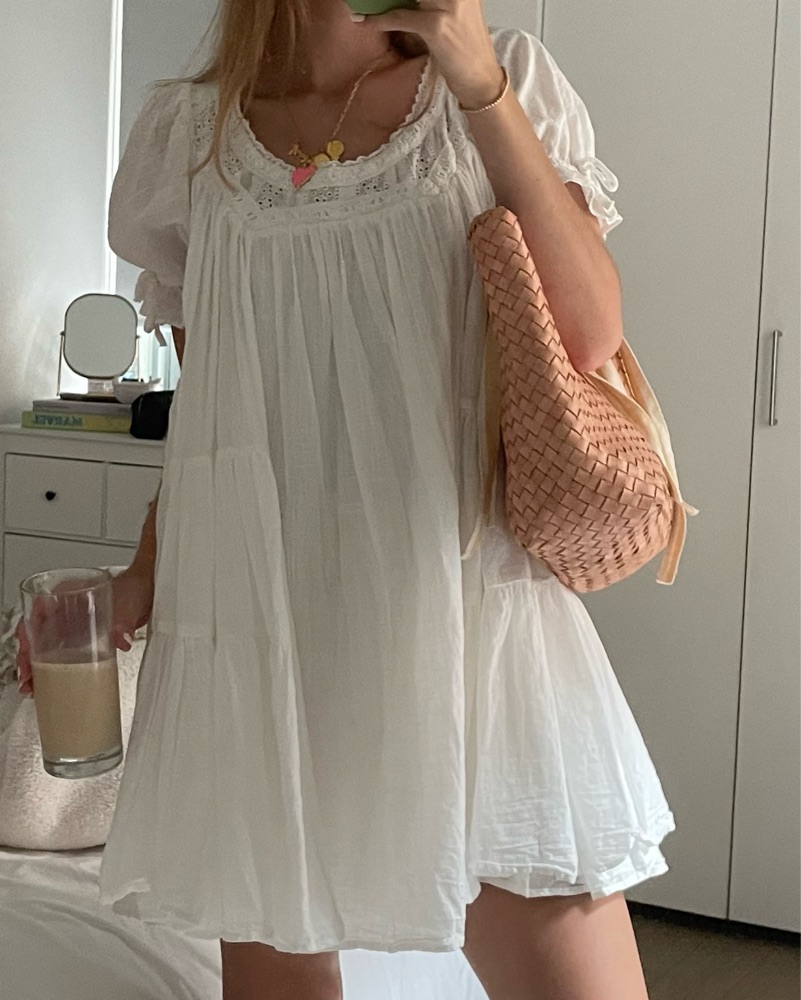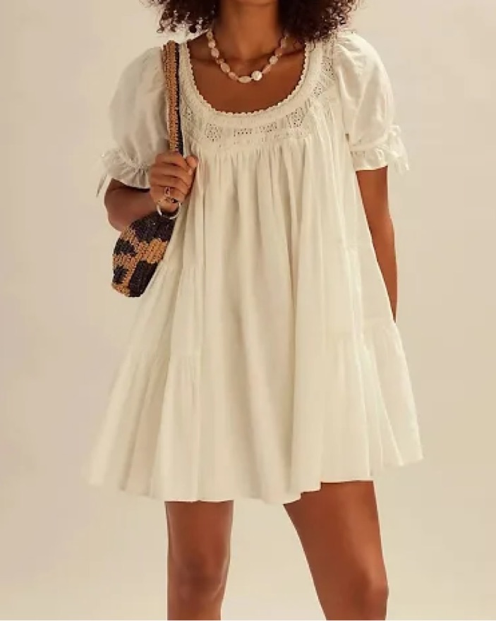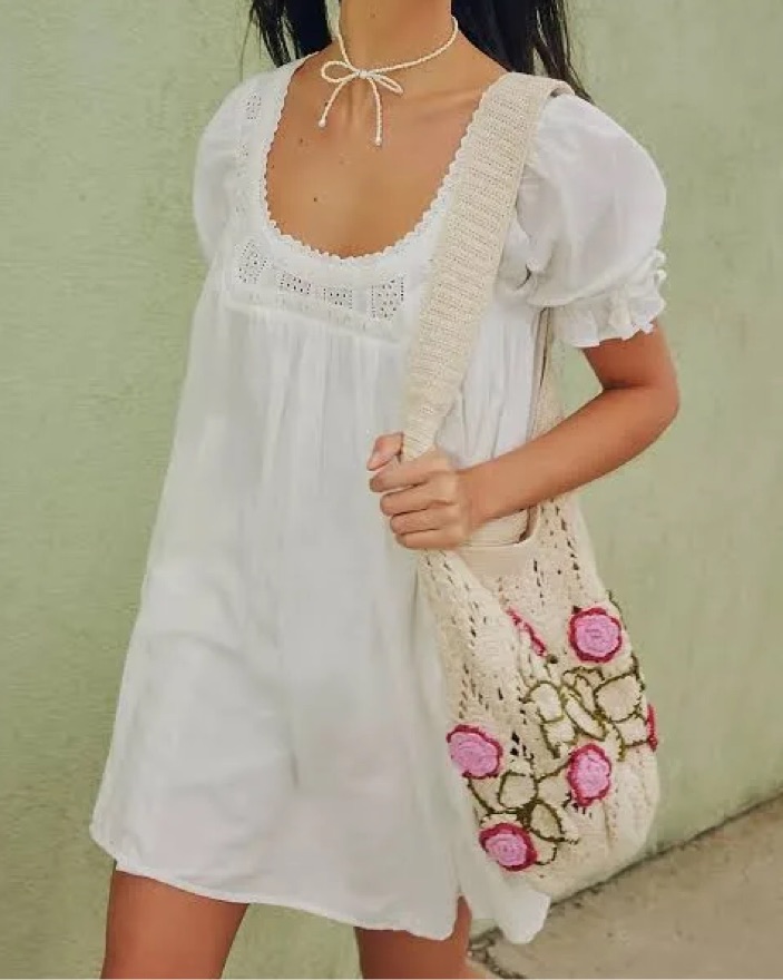 This romantic white dress with delicate lace detailing and puff sleeves is perfect for a summer garden party or casual everyday wear.