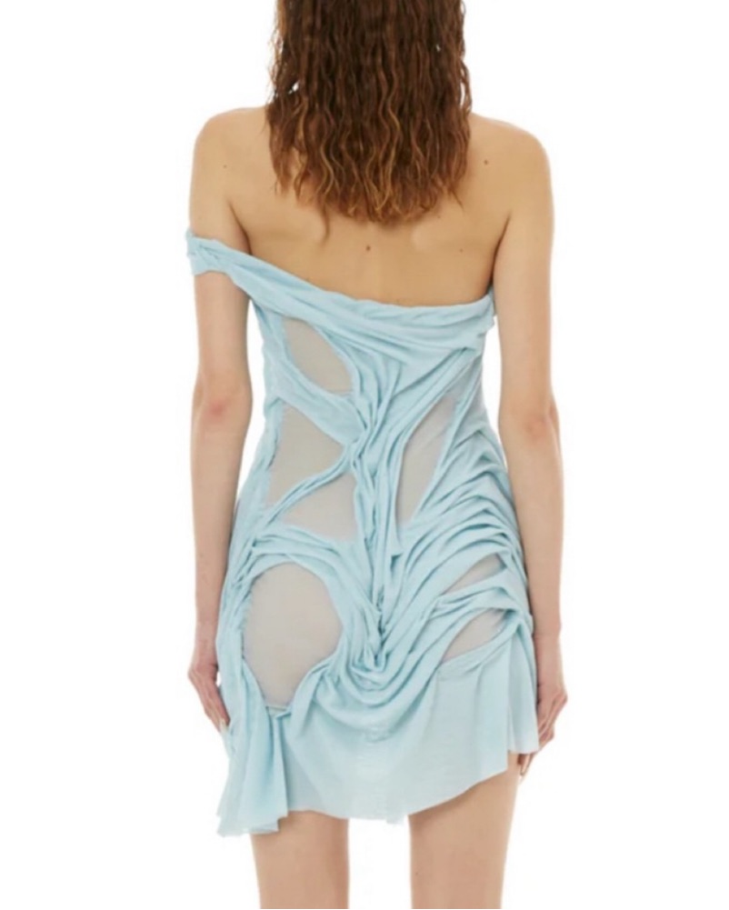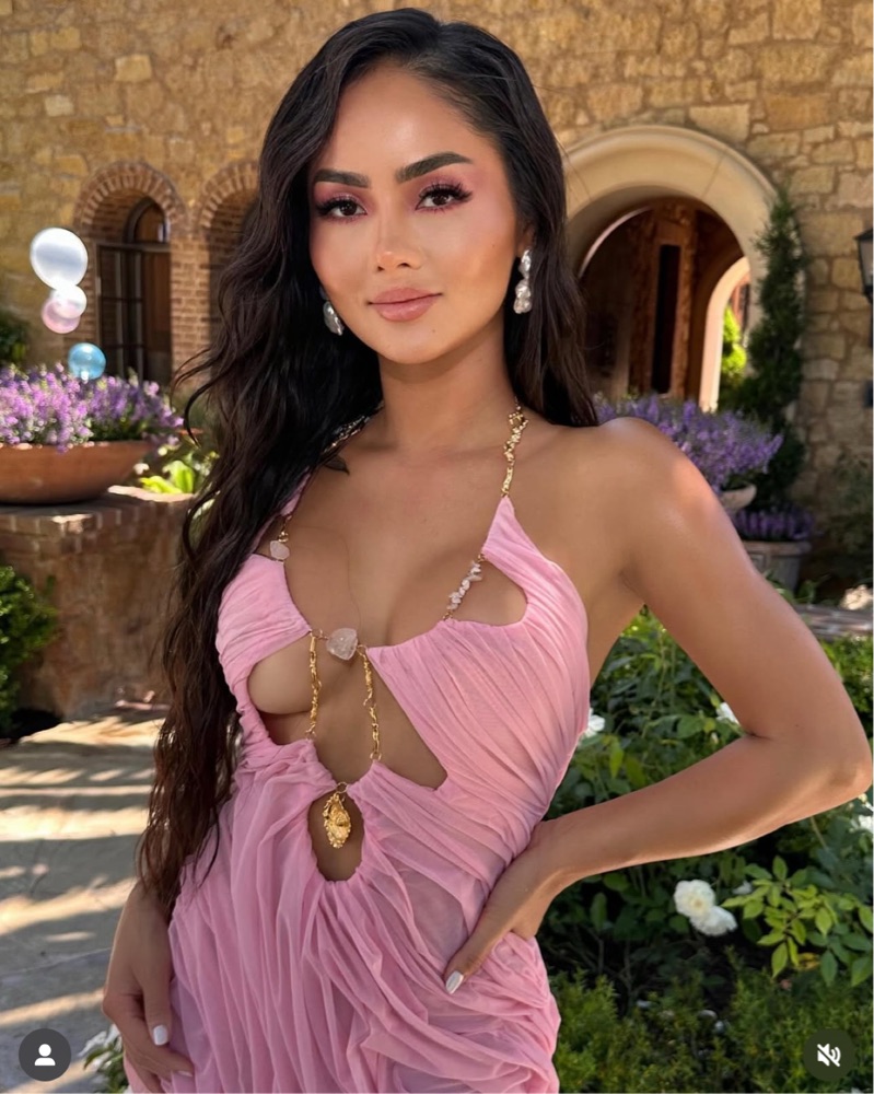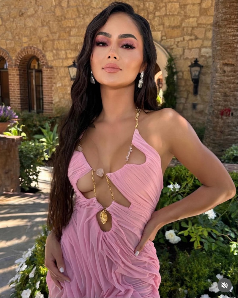 This is a custom Di Petsa dress. I got the “Theia” dress (was originally designed in blue) made in pink, with gold hardware and rose and white quartz crystals.