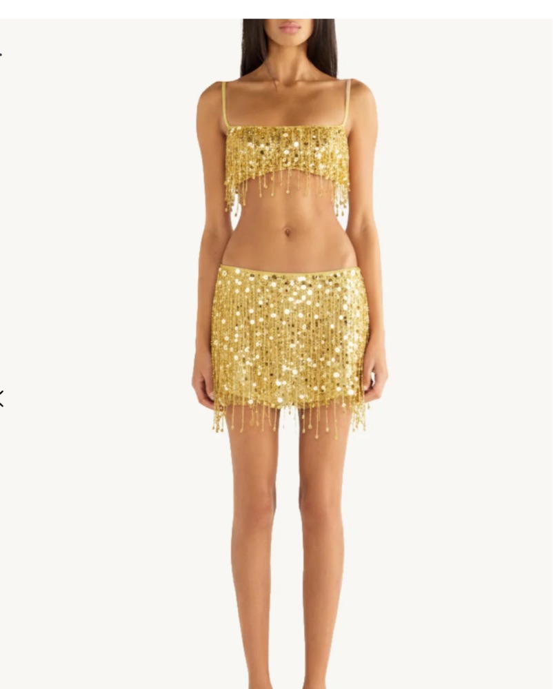 Yasmin Hand Beaded Mini Skirt - Gold, XS and Yasmin Hand Beaded Bralette - Gold Xs