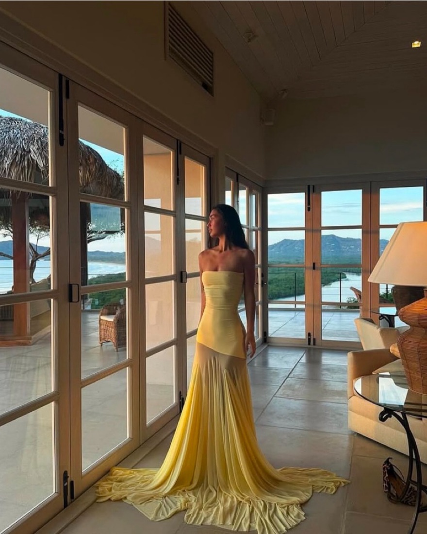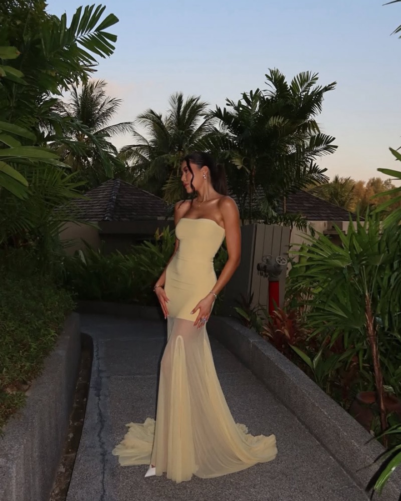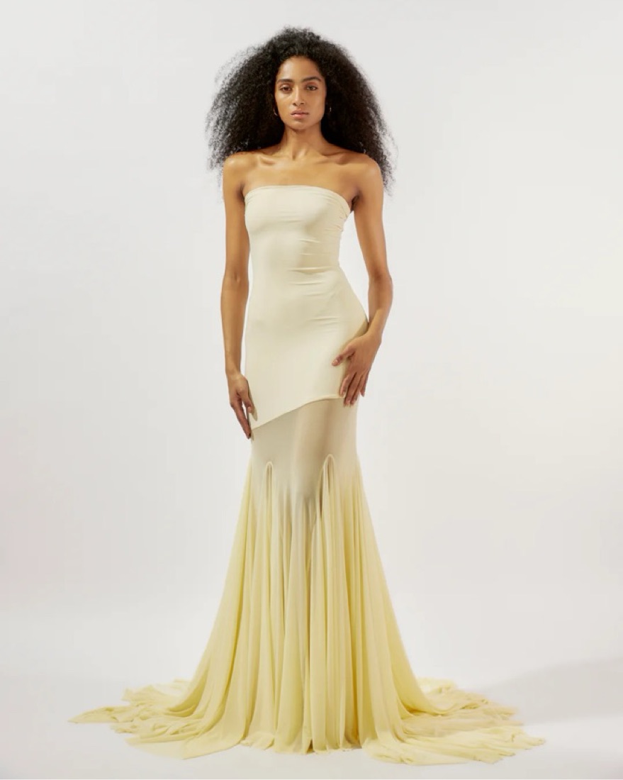 Fits XS- S, perfect for wedding guest. The trail is shorter on the front
