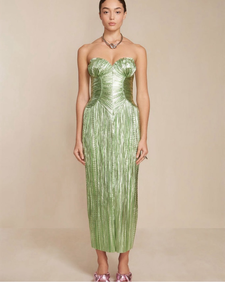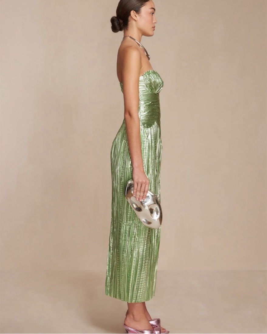 The Ashika Gown shines in metallic plisse. The vertical folding at the bust and through the midi-length skirt are balanced by a sweetheart neckline and a highly-structured corset top. The stunning fabric and construction create an ultra-slimming effect.