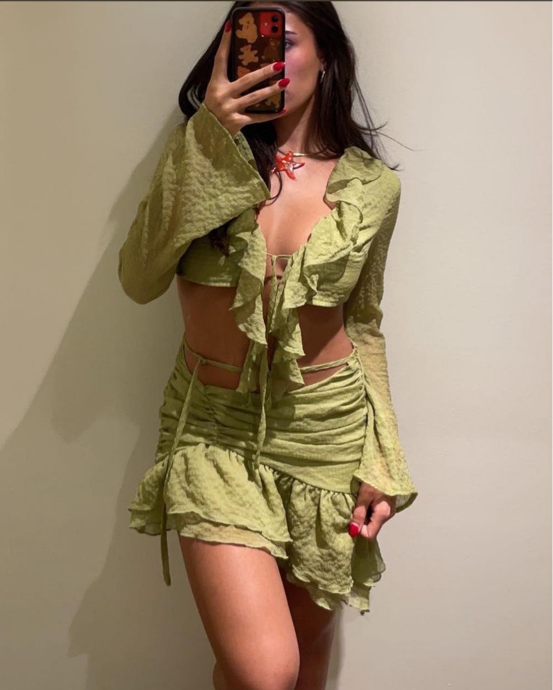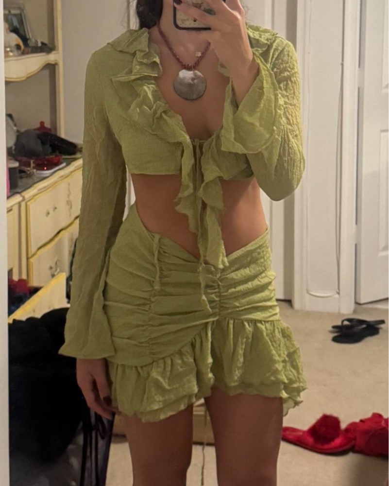 Green long sleeve ruffle crop top and skirt set🌴🌺🐚 Adjustable tie in the center, adjustable straps. So flattering and perfect for warmer seasons & a vacation look! #ruffles #festival #tropical #vacation #island
