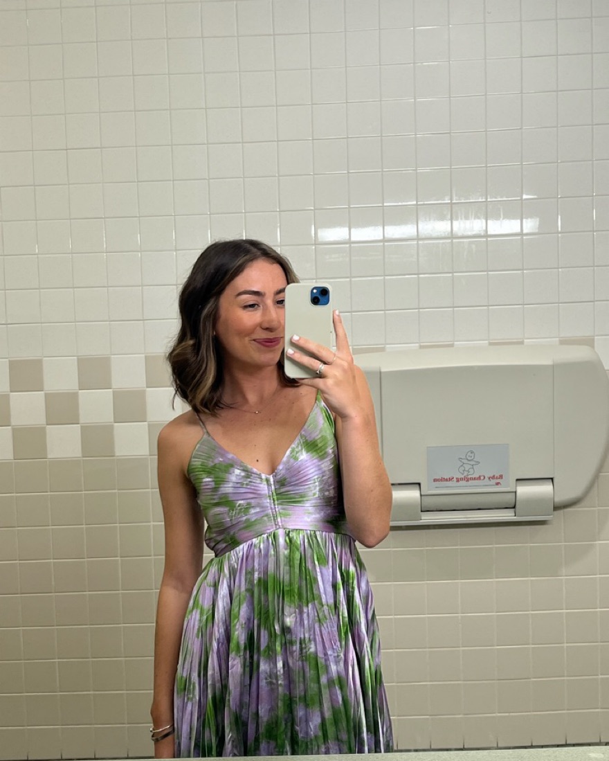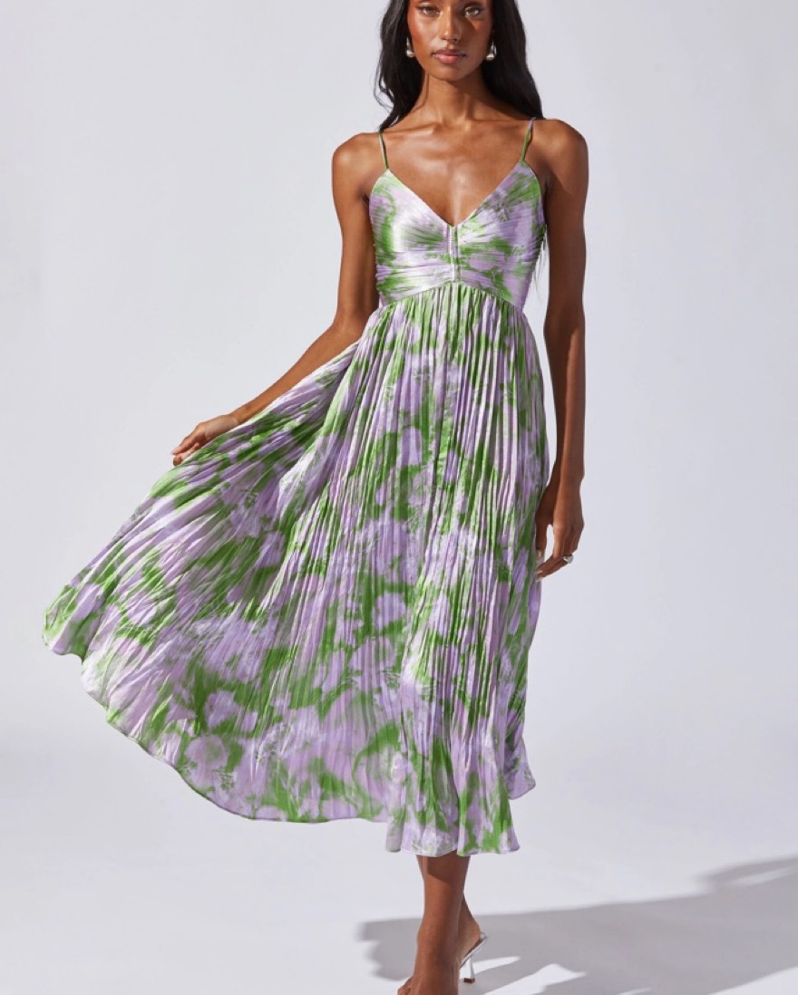This stunning pleated midi dress is perfect for a summer wedding or special event. Purple and green floral