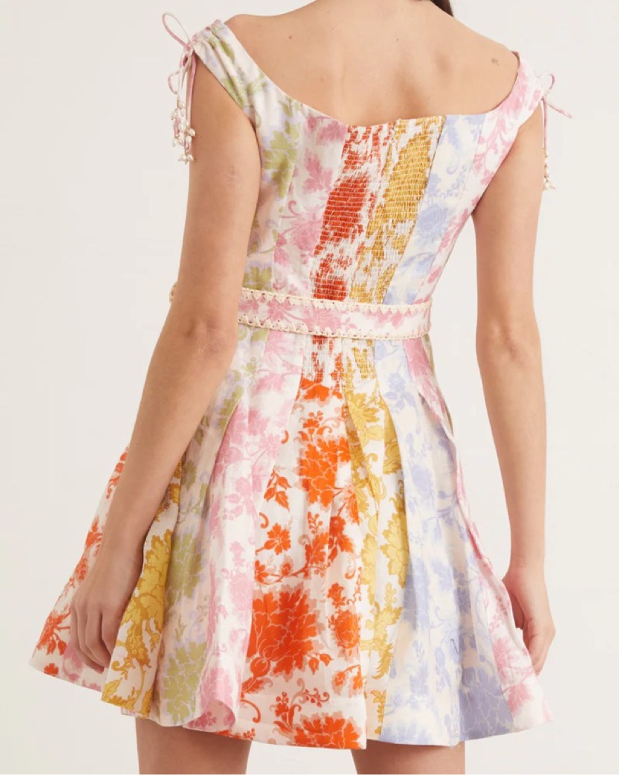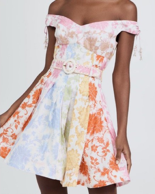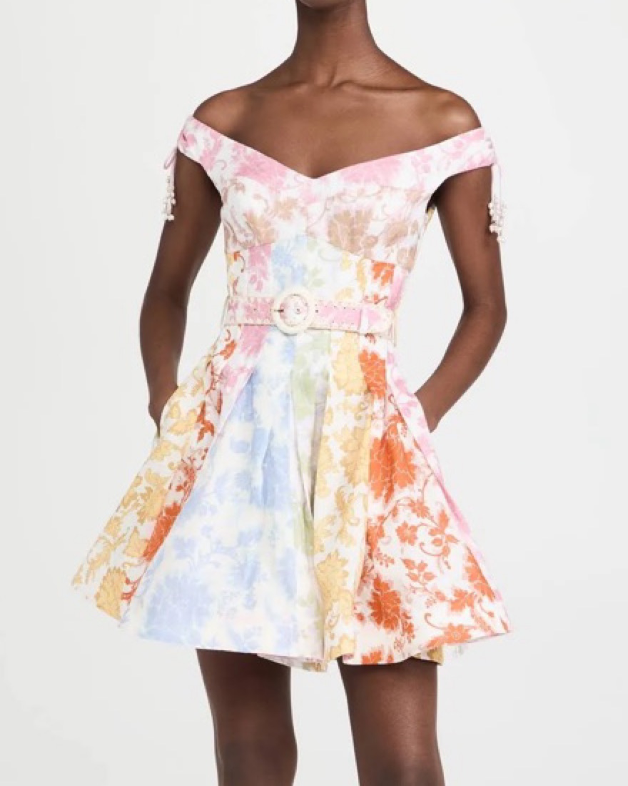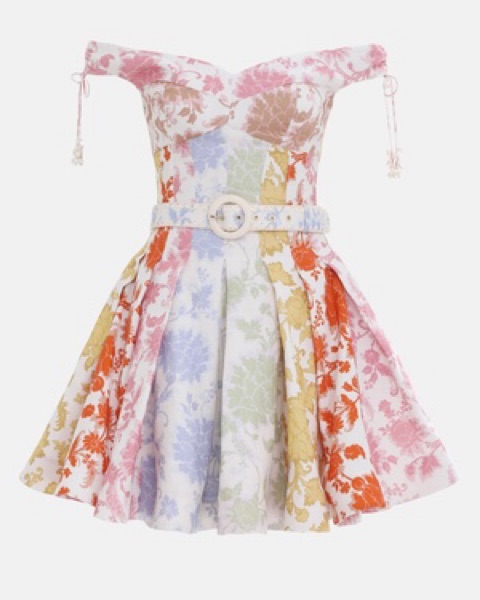 Off the shoulder dress from their Resort 22 Collection. This mini dress features a fit and flare silhouette in their standout floral print. Wear yours out with heels and a petite bag.