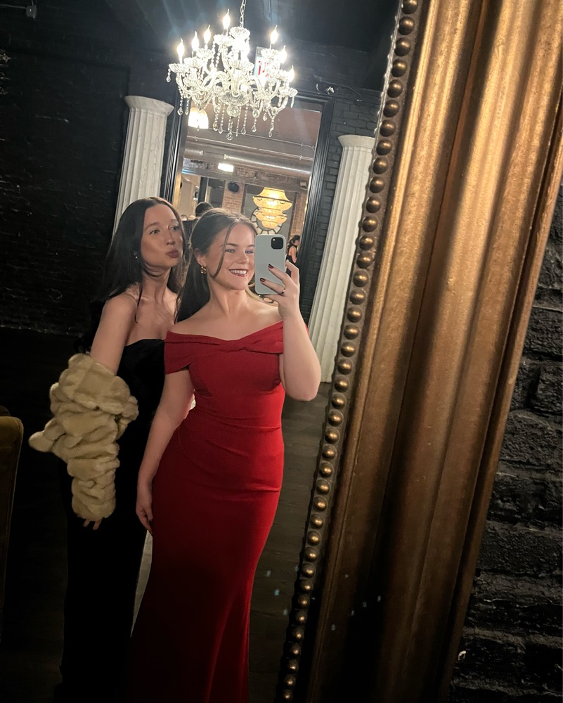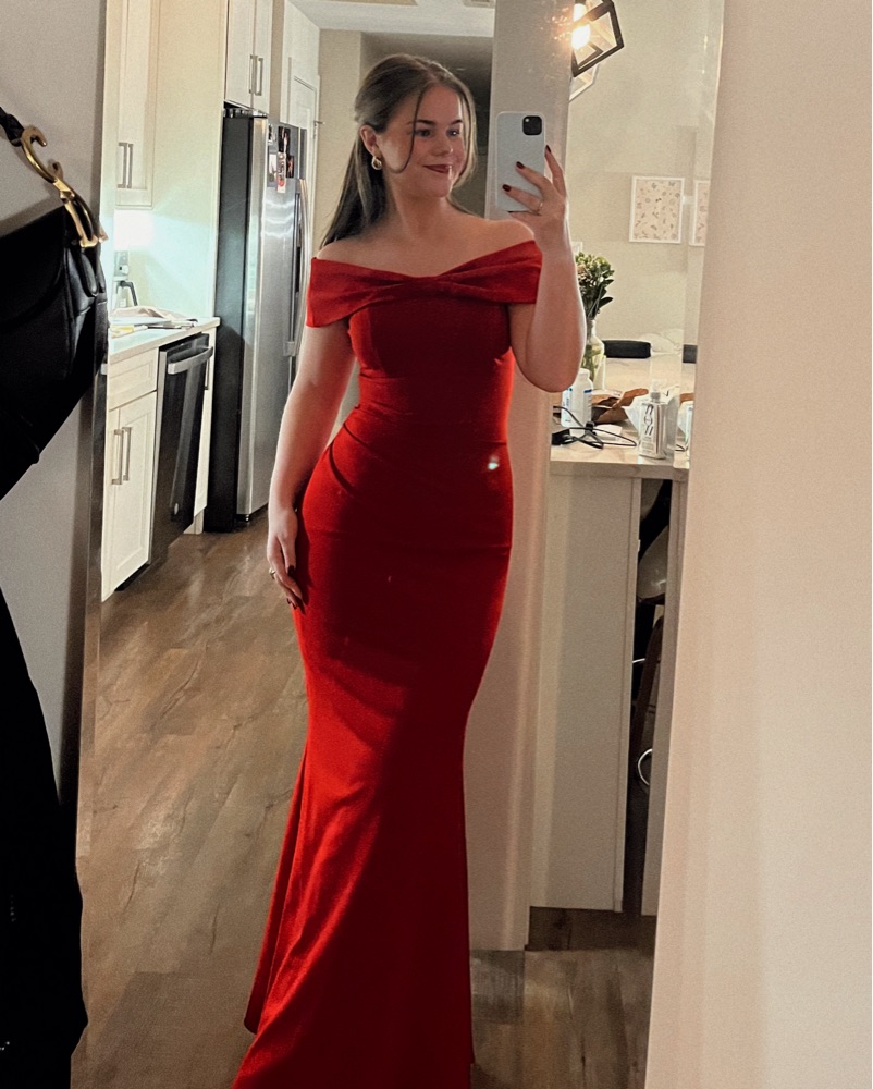 Beautiful red gown perfect for holiday parties and formal events. Thick material that snatches you in! I’m 5’5 and wore tall 3” heels and the gown was perfectly floor length.