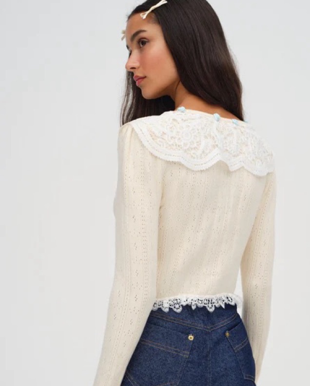 Cream cardigan w/ white lace collar + trim. I’ve only worn this once!