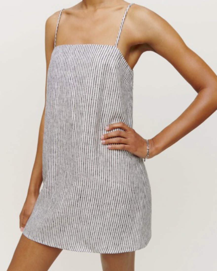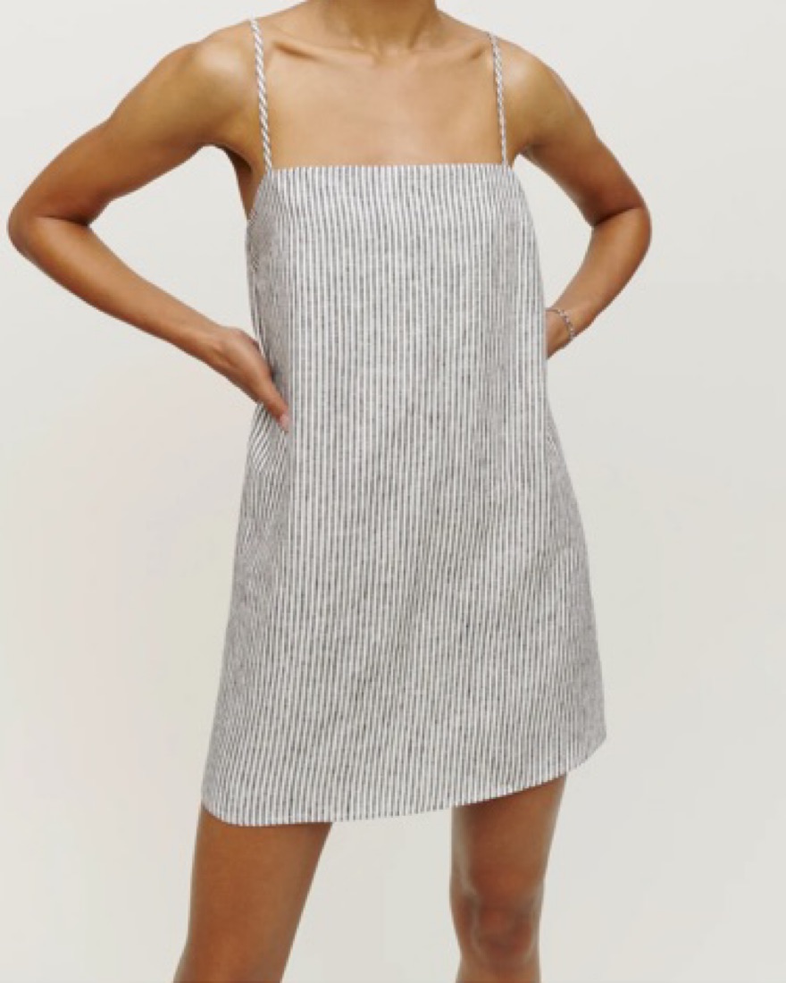 mini dress with an a-line skirt, straight neckline and adjustable, tie straps. It's relaxed fitting throughout if you're looking for something not too clingy.